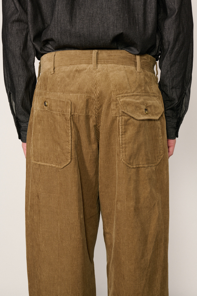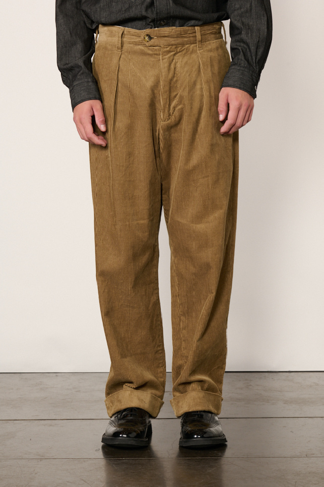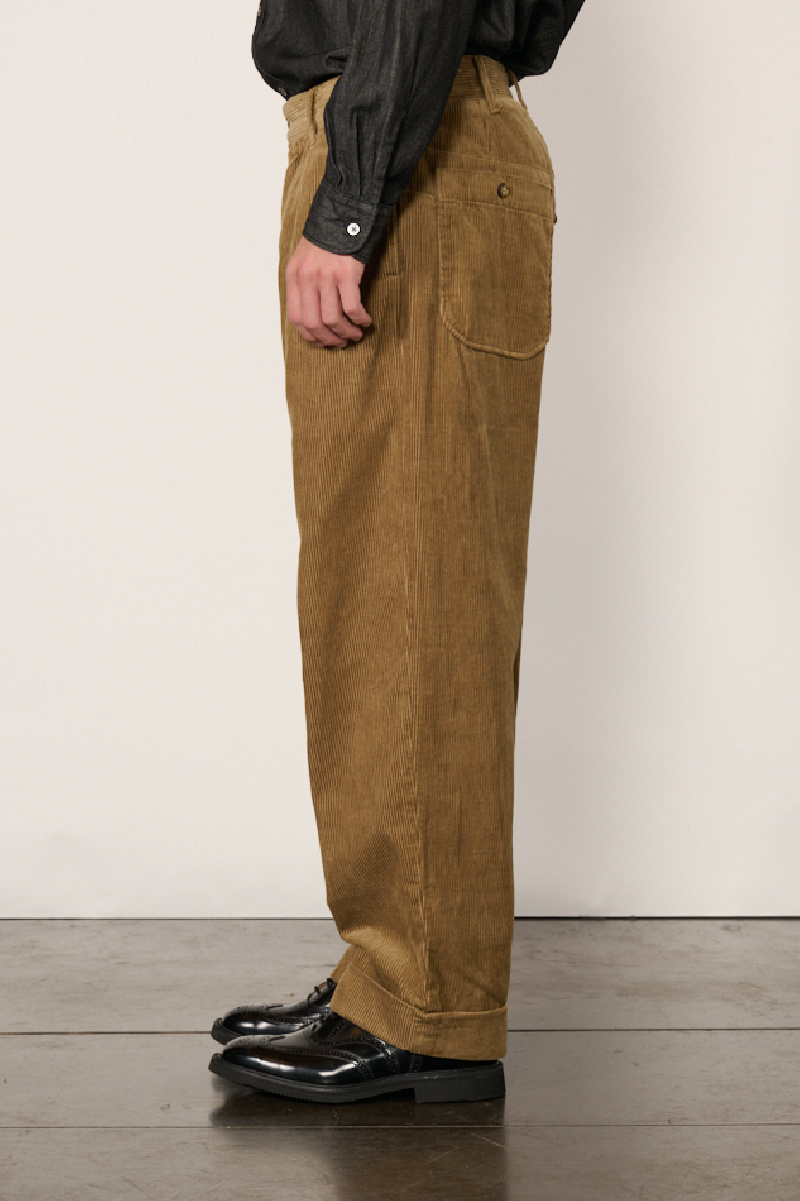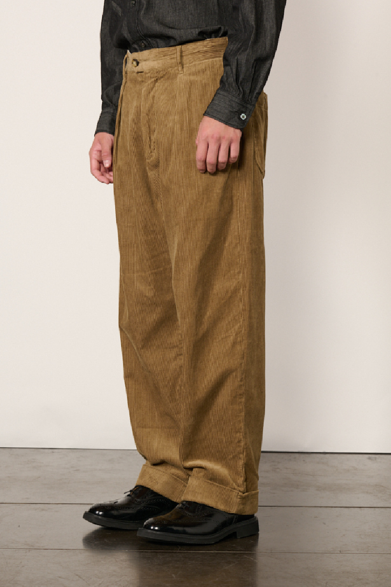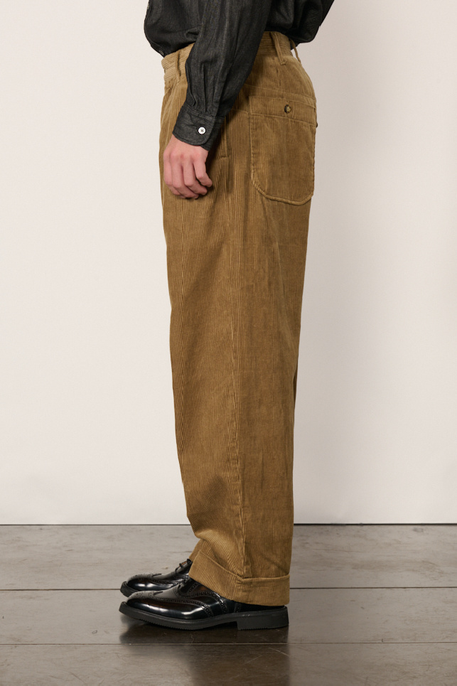 They feature a loose fit with front pleats, a zip closure, and slanted front pockets. At the back, an asymmetric pocket design adds a touch of originality: one is patch-style, the other has a flap.