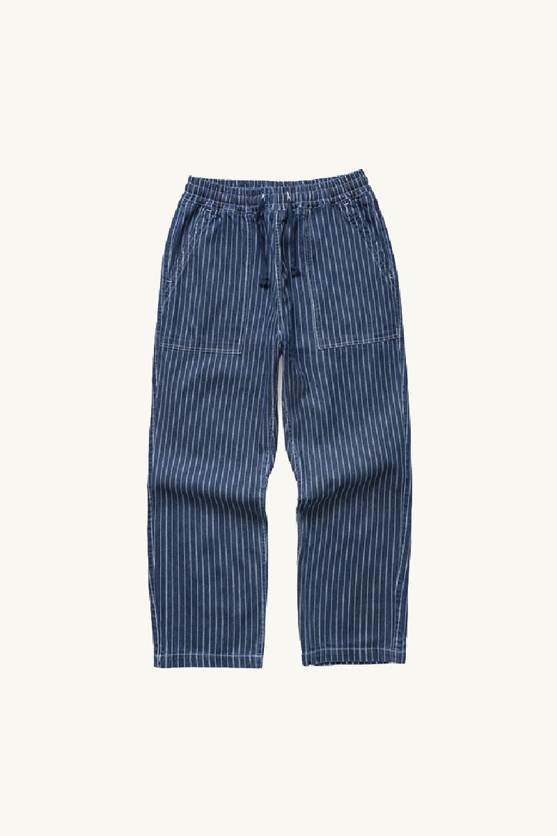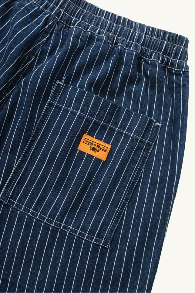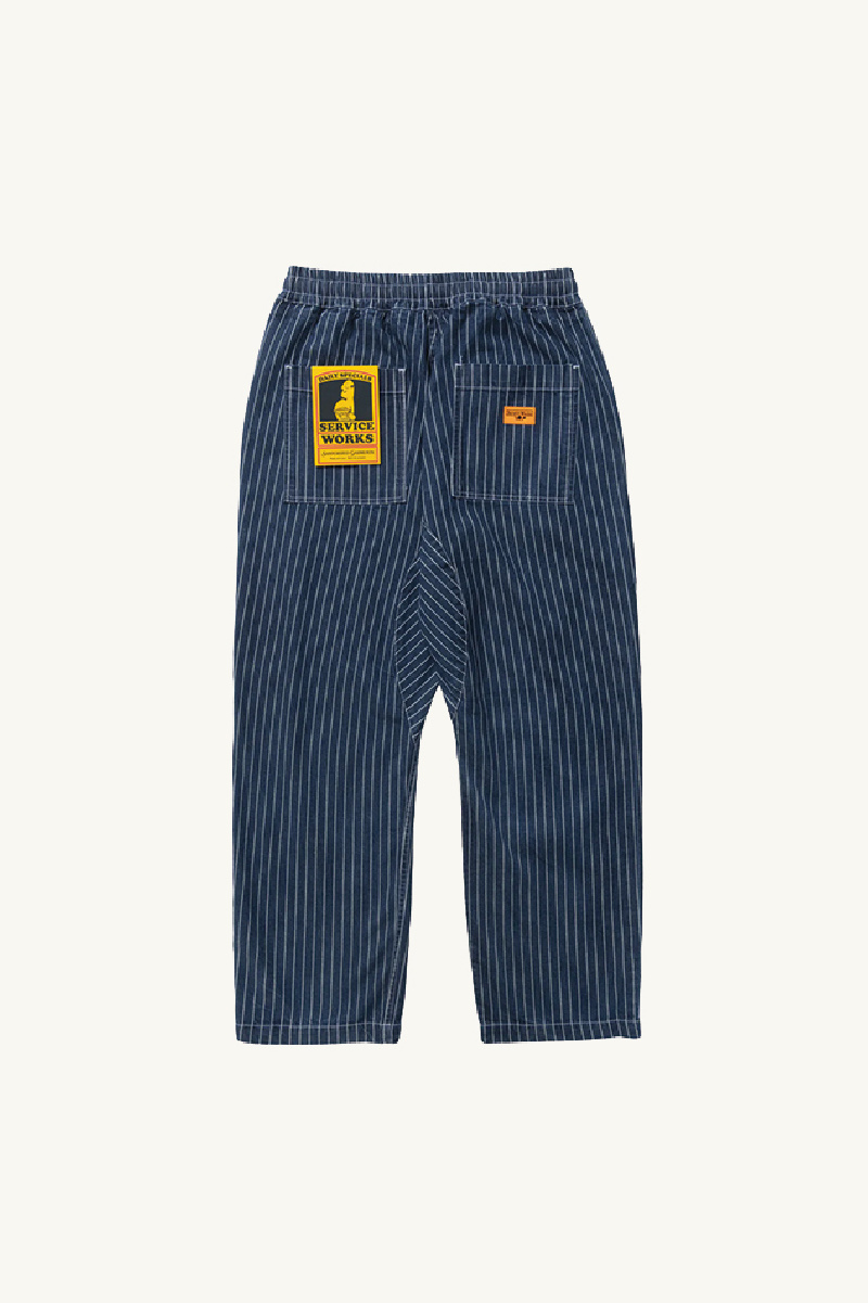 Chef Pants made of indigo denim with white stripes, from the brand Service Works.