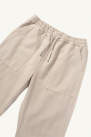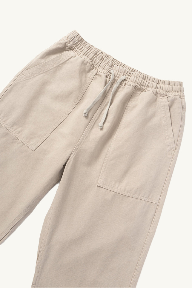 Revisiting the kitchen trousers, they offer a relaxed silhouette with a wide straight leg, an elasticated waistband with drawstring, two side pockets and two patch pockets at the back with woven label.