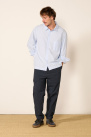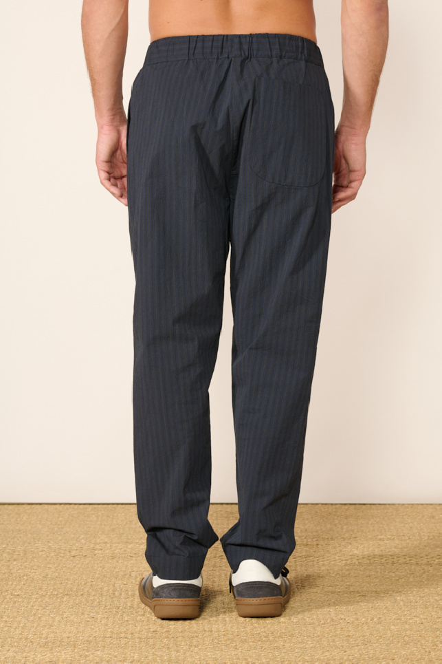 Niko trousers with fine stripes in navy cotton by Bergfabel.