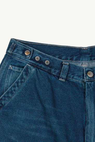It offers a loose silhouette with a wide leg, 5-pocket construction, a waistband with snap fastener and a snap button opening and zip.