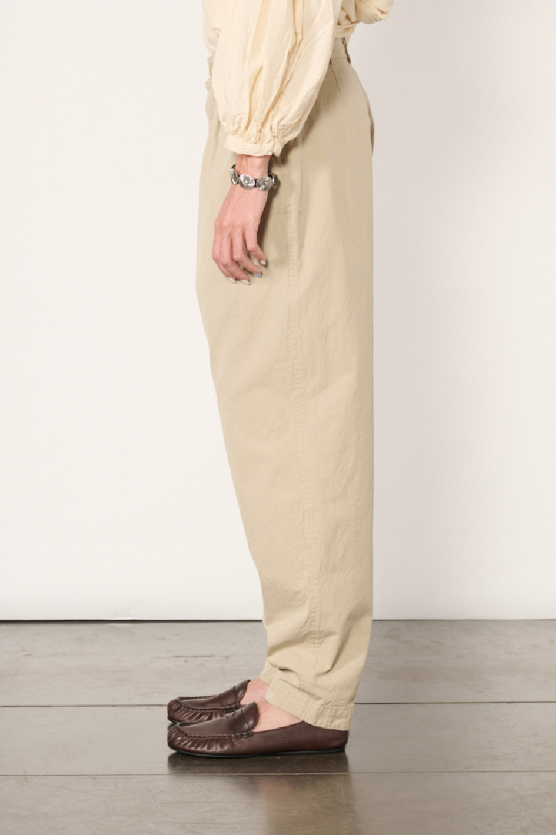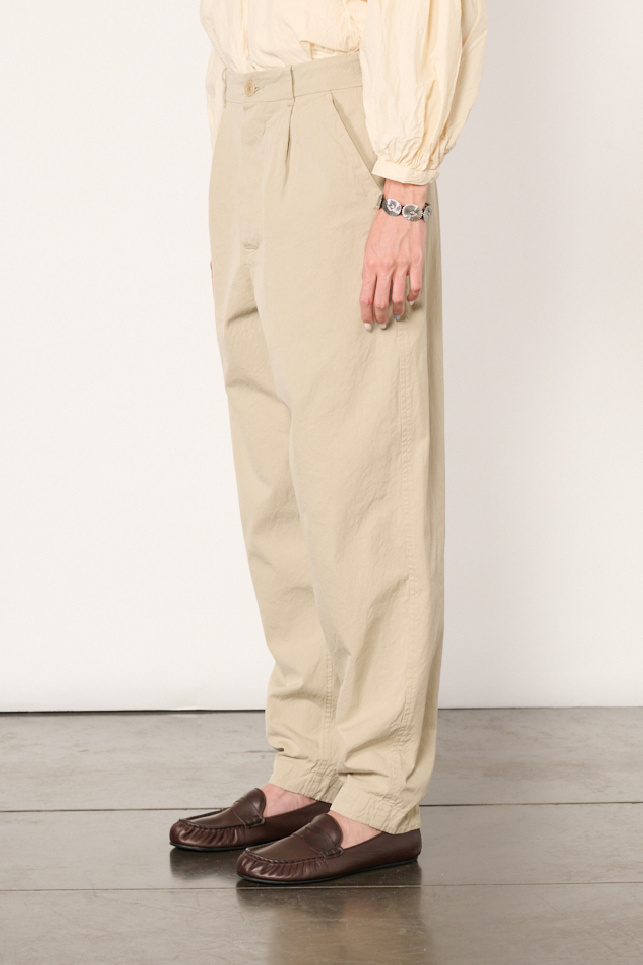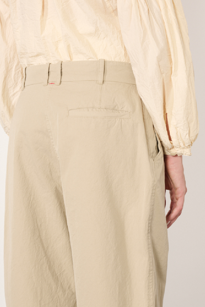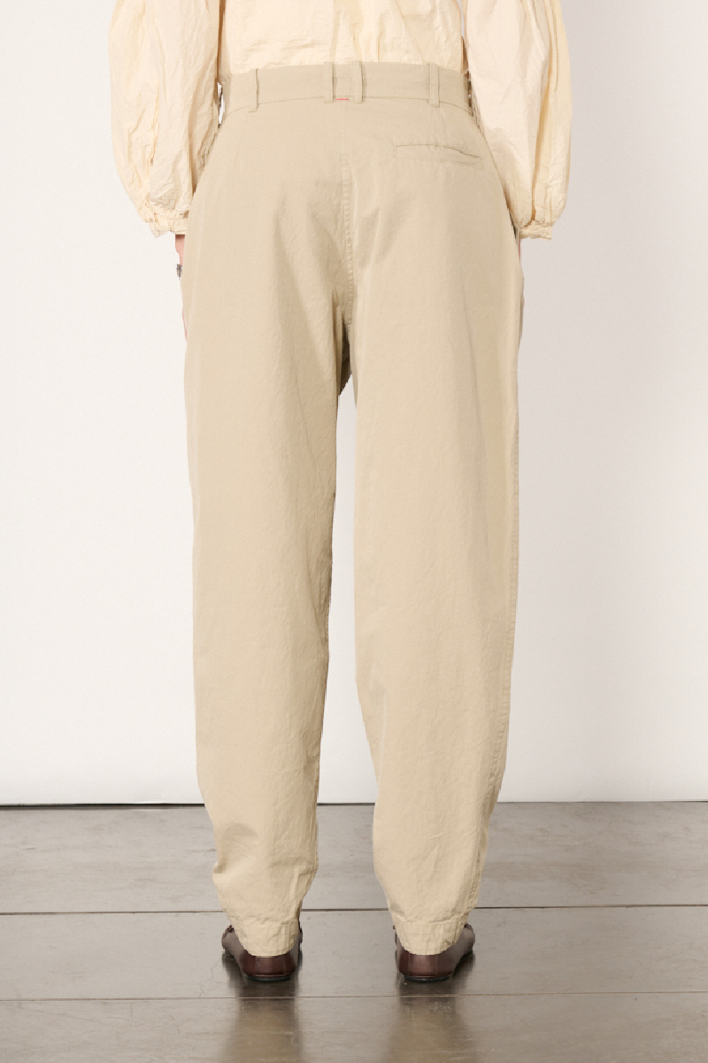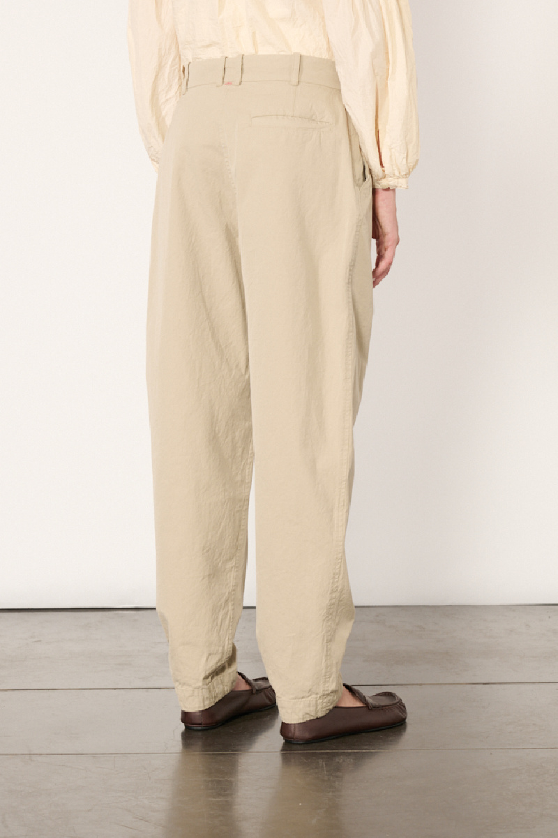 Beige Mili Horishi trousers by Casey Casey, made from cotton Double Cot, the brand's signature fabric, with a washed finish giving it a subtle texture.
