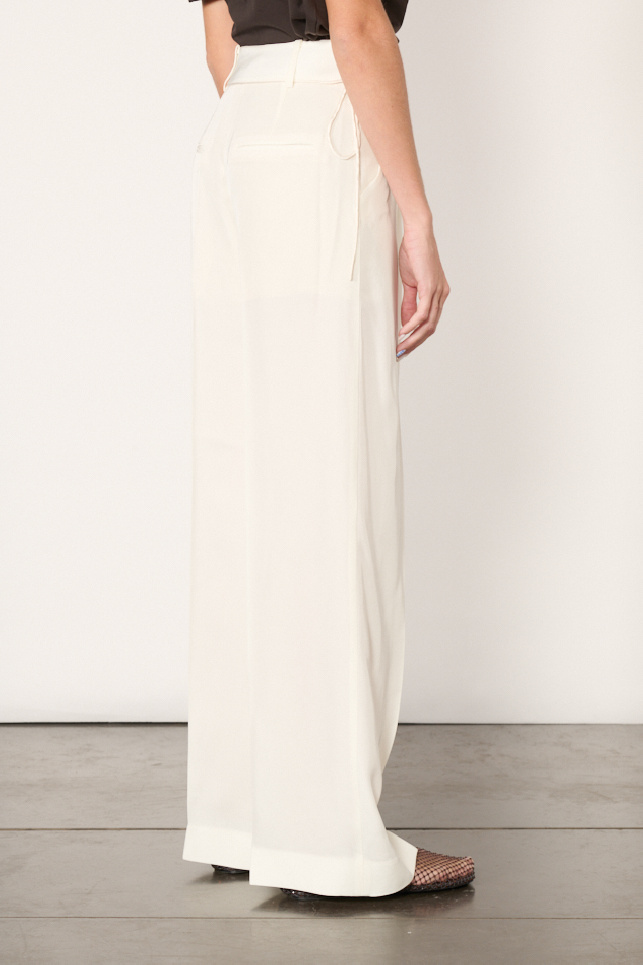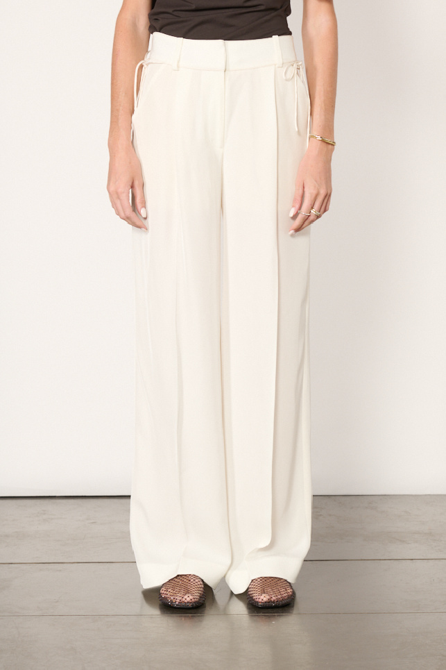 Featuring a slightly flared silhouette, these pants sit low on the hips for a modern, comfortable look. They are highlighted by a silk contrast tape at the waistband and practical pockets at the front and back.