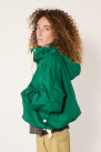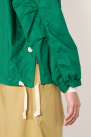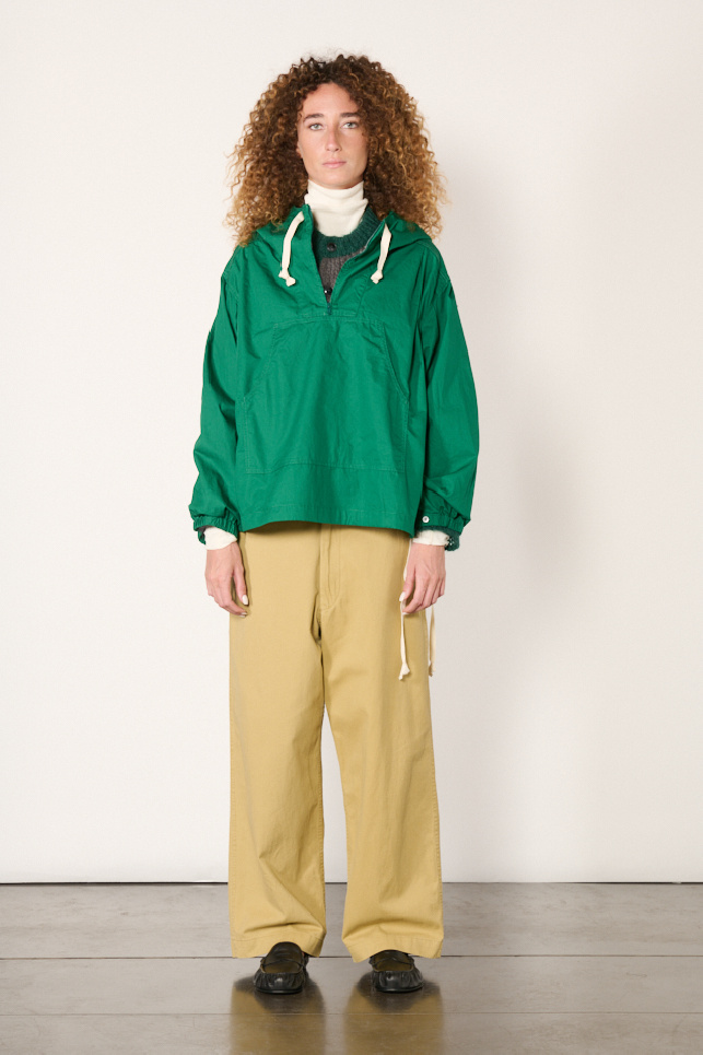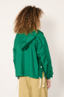 It features a loose, straight cut that falls to the hips, a hood with adjustable drawstring and zip, two side slits with drawcord and contrasting white buttons, a front kangaroo pocket, and adjustable elasticated cuffs with snap buttons.
