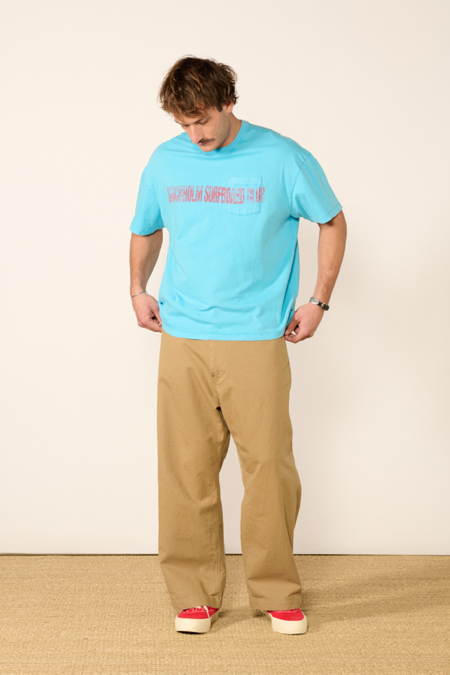 It offers a loose silhouette with a wide leg, 5-pocket construction, a waistband with snap fastener and a snap button opening and zip.
