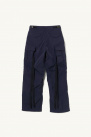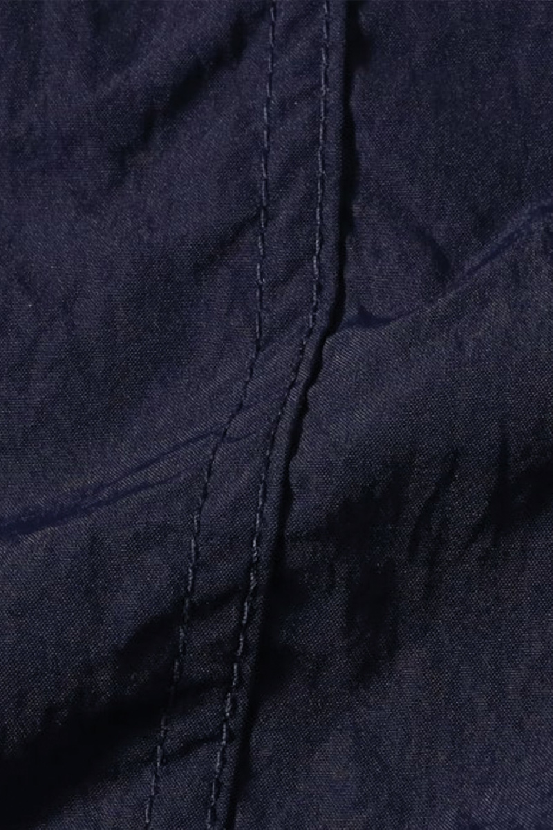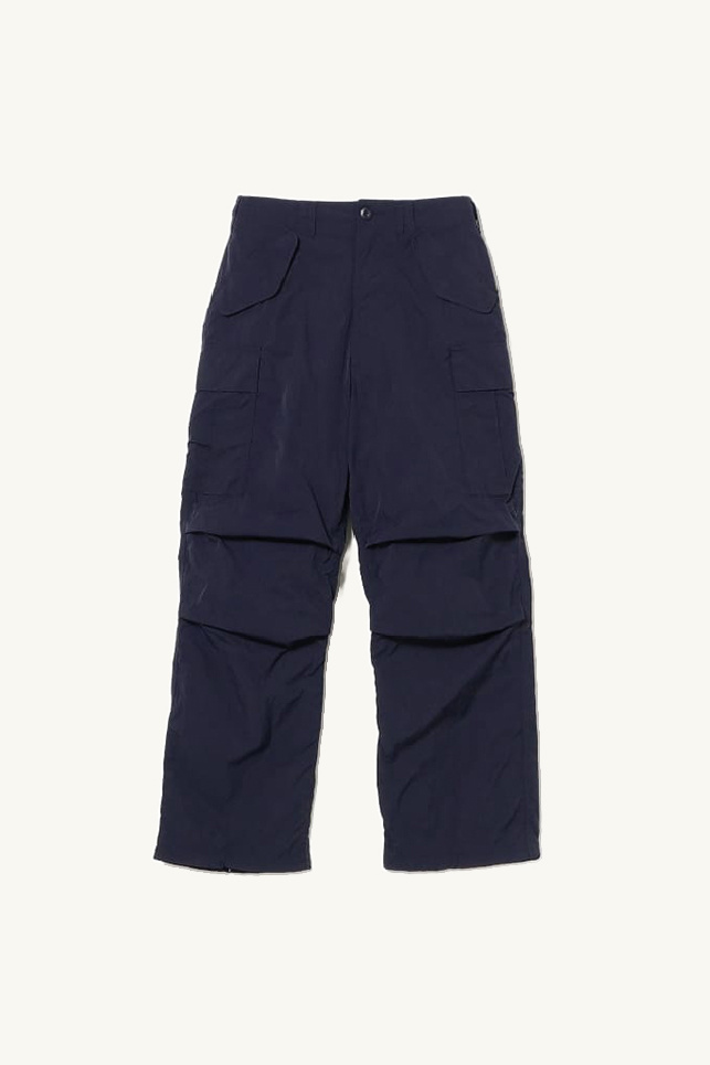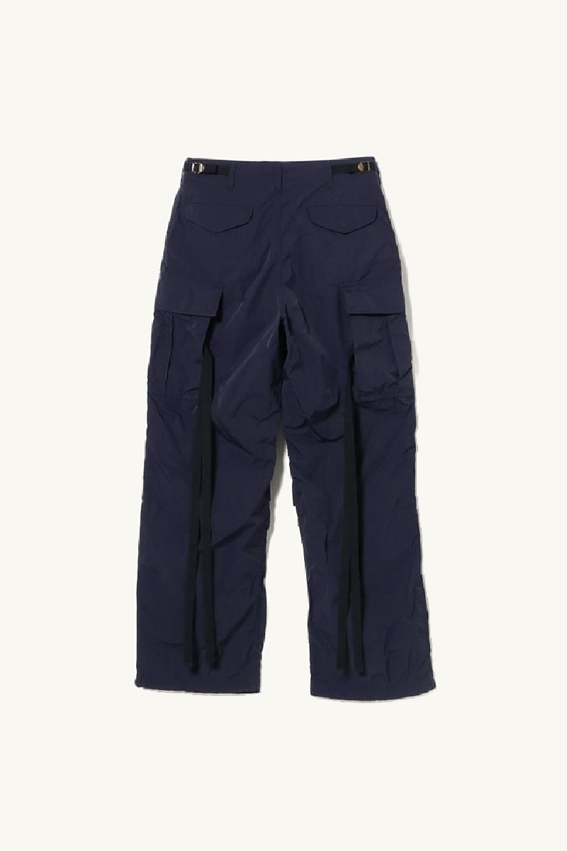 Cargo pants made of water-repellent navy nylon poplin, with a naturally creased texture, from the brand Beams +.