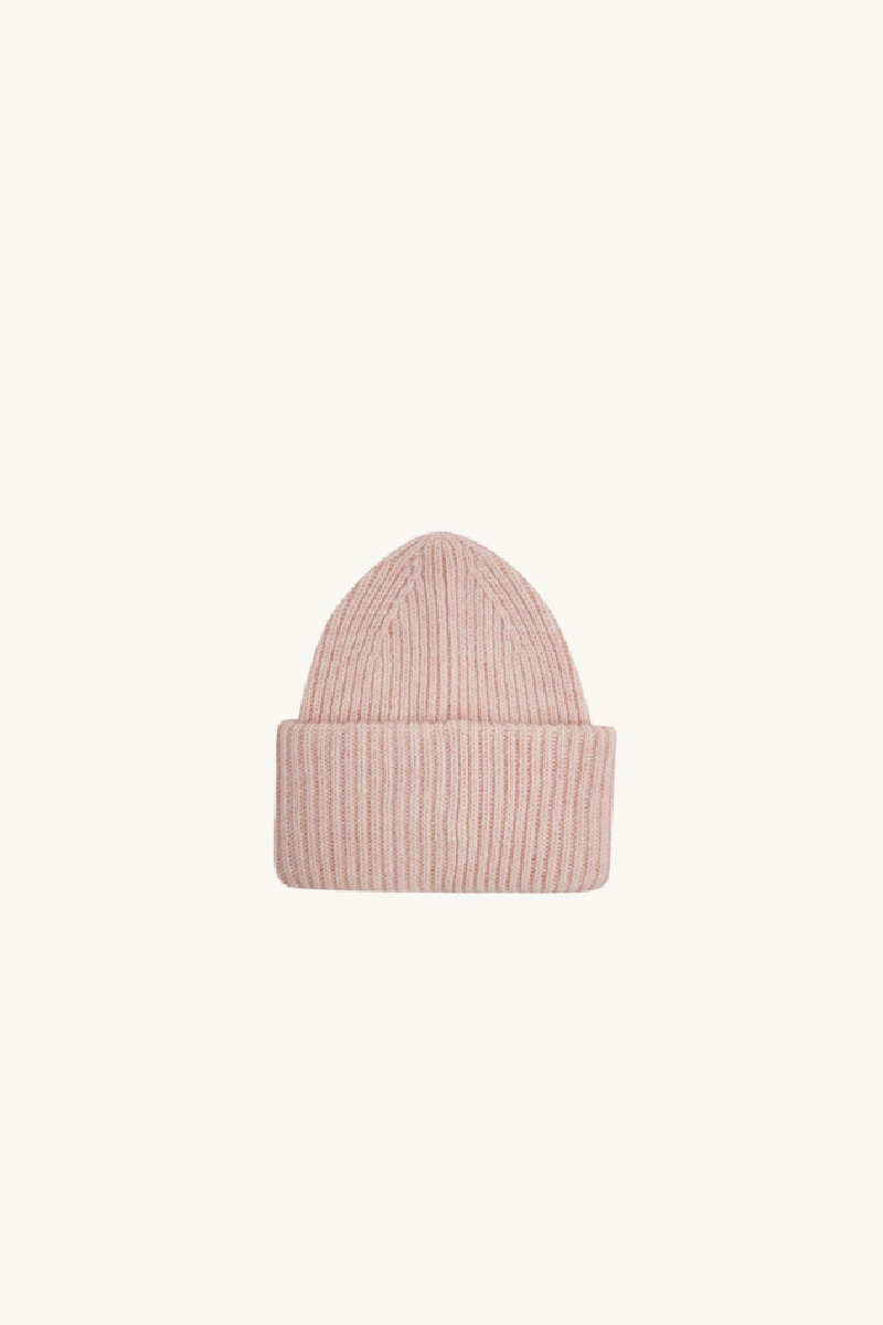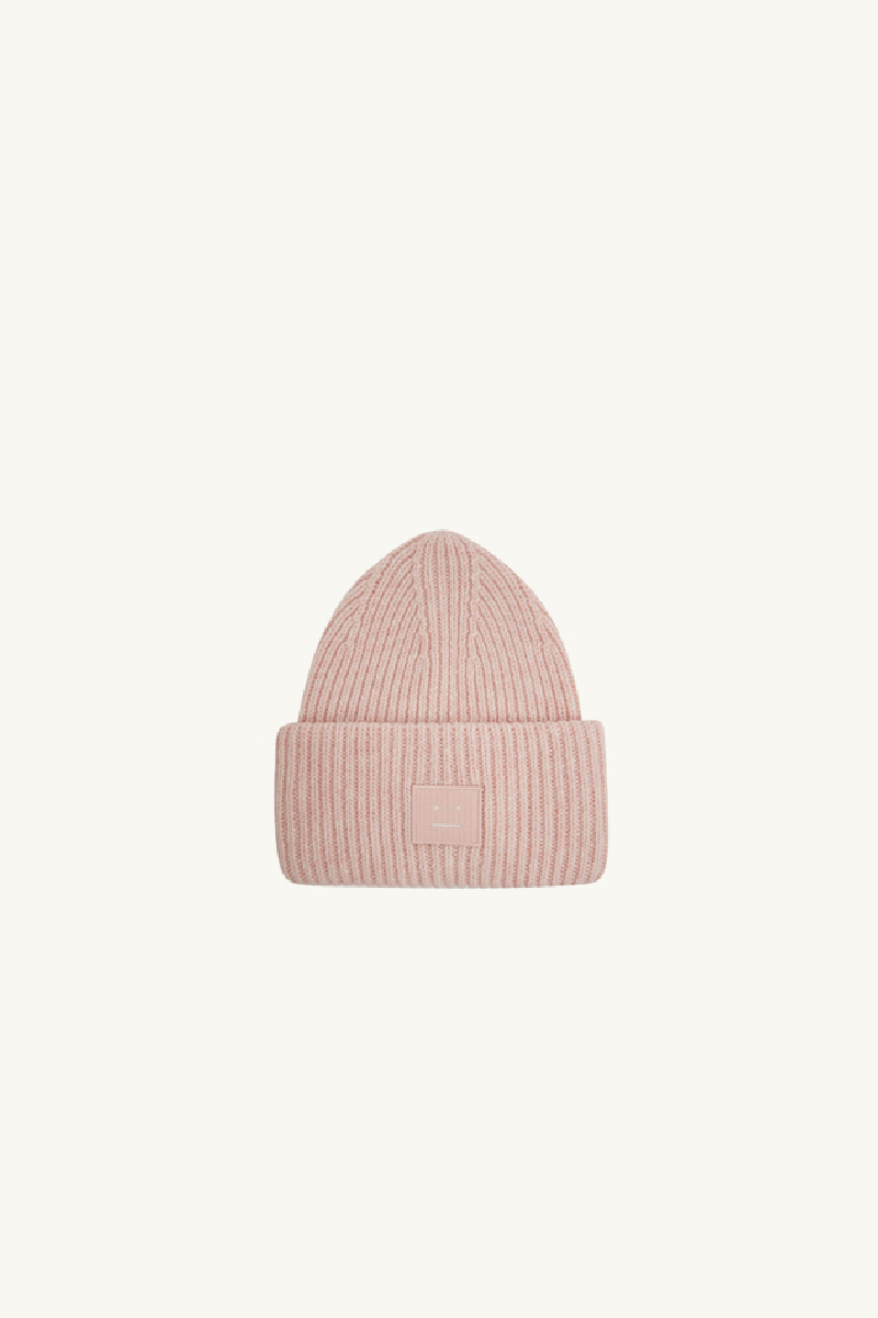 Acne Studios wool beanie in pale pink, Acne Face logo.