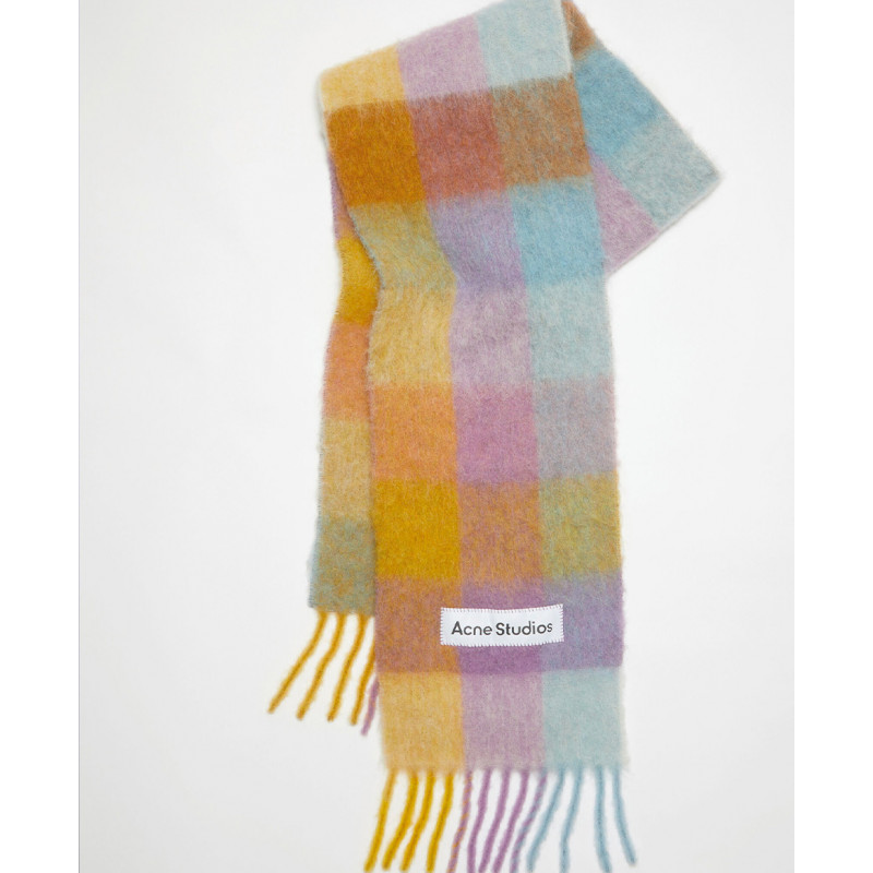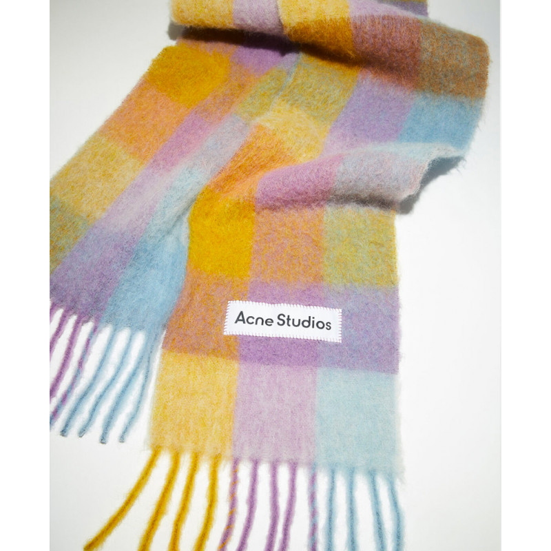 Acne Studios shawl, in alpaca and wool mixed with checks, purple, yellow and blue, fluffy material, patch with logo "Acne Studios".