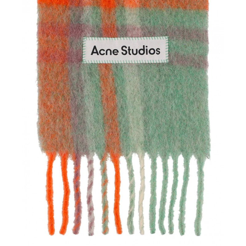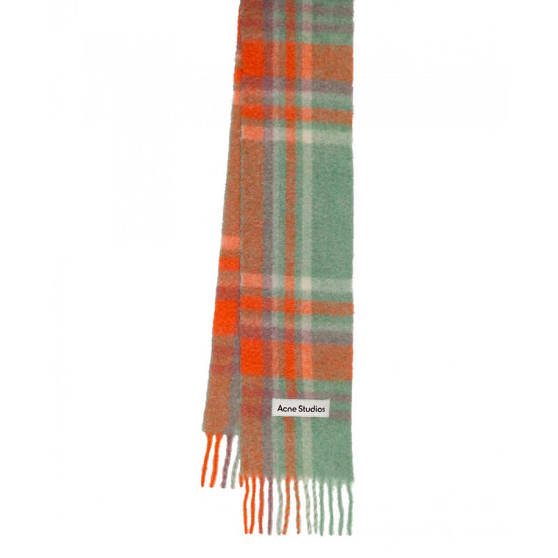 Acne Studios shawl, in alpaca and wool mixed with checks, orange, lilac and blue, fluffy material, patch with logo "Acne Studios".