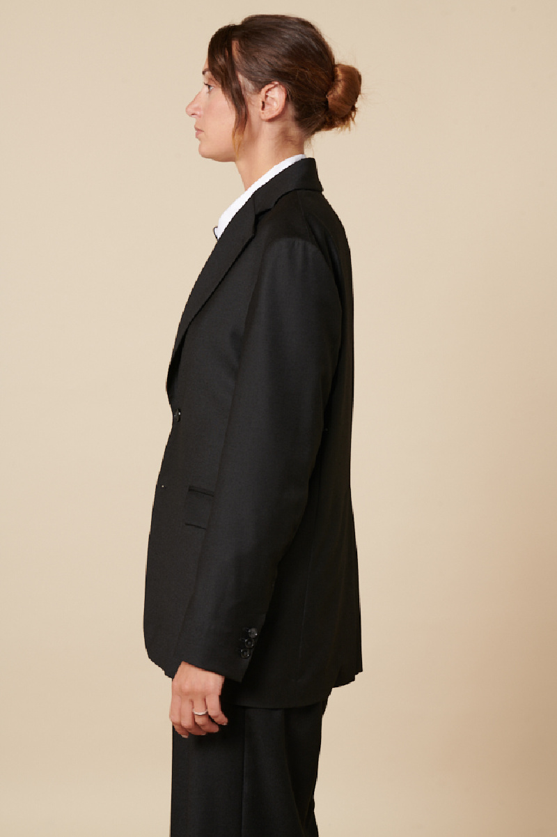 The Gala suit jacket from Barena in black has an oversized, long cut, three buttons on the bottom of the long sleeves, a full lining, two flap pockets and an inside pocket, a two-button front fastening and a slit on the lower back.