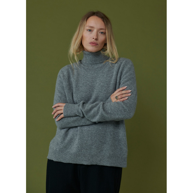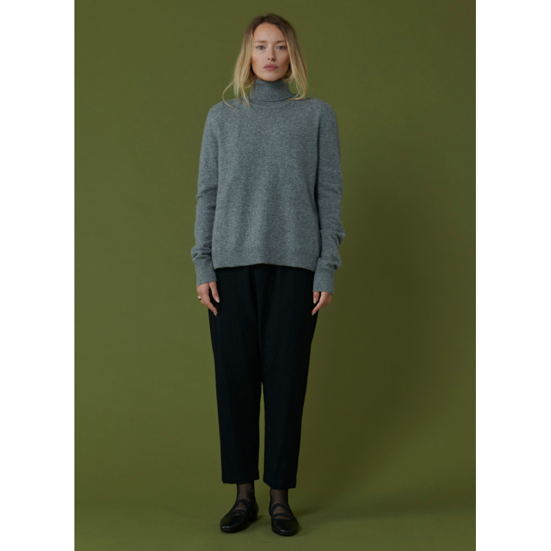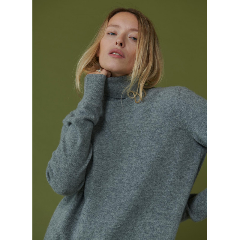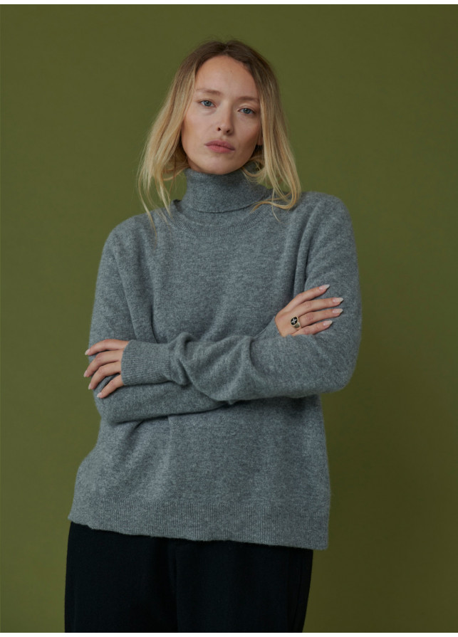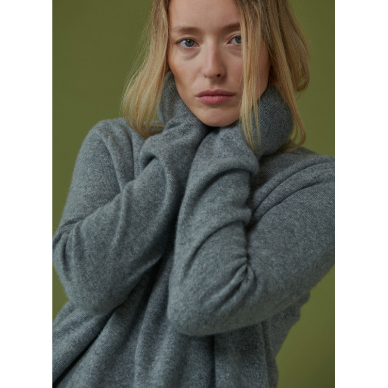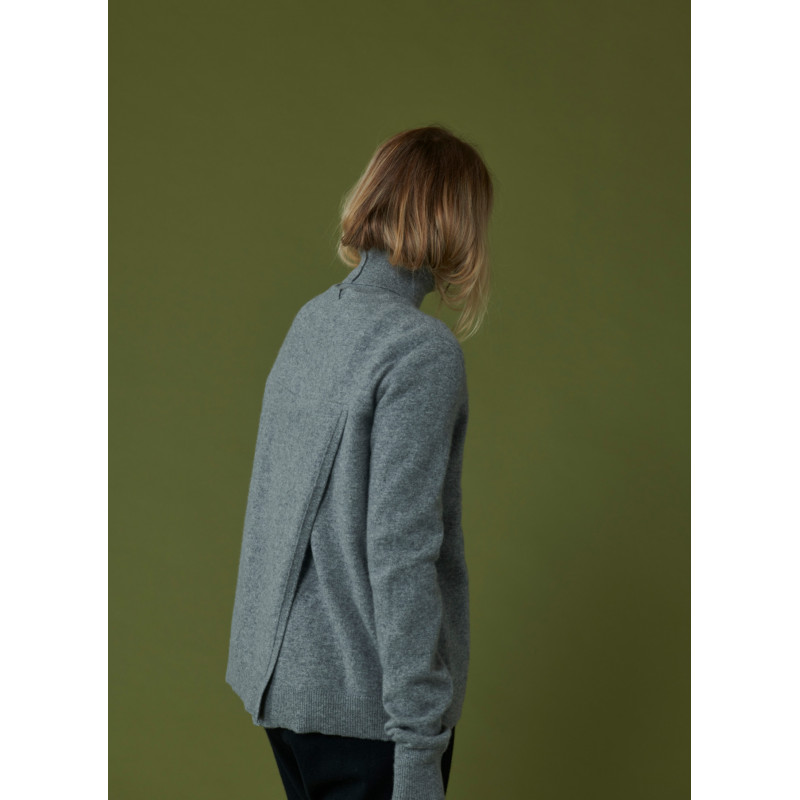 Sibel Saral sweater, in grey cashmere, soft touch, long sleeves, elastic cuffs, round neck with v-detail at the nape of the neck, slit open to the bottom of the back on the right side.