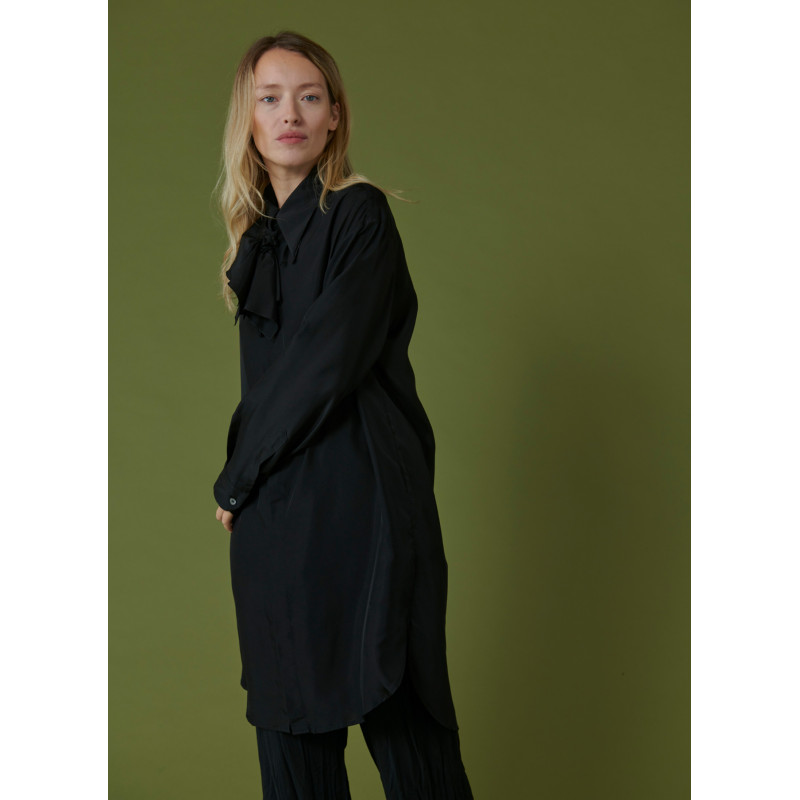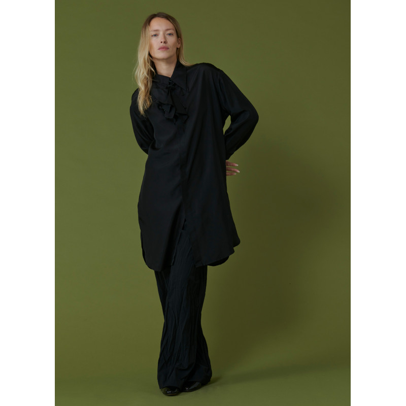 Dress Shirt Barena, black, mid-length cut, longer on the back and slightly shorter on the front, long sleeves, silver button closure, pressure at the wrists, light slit on each side.