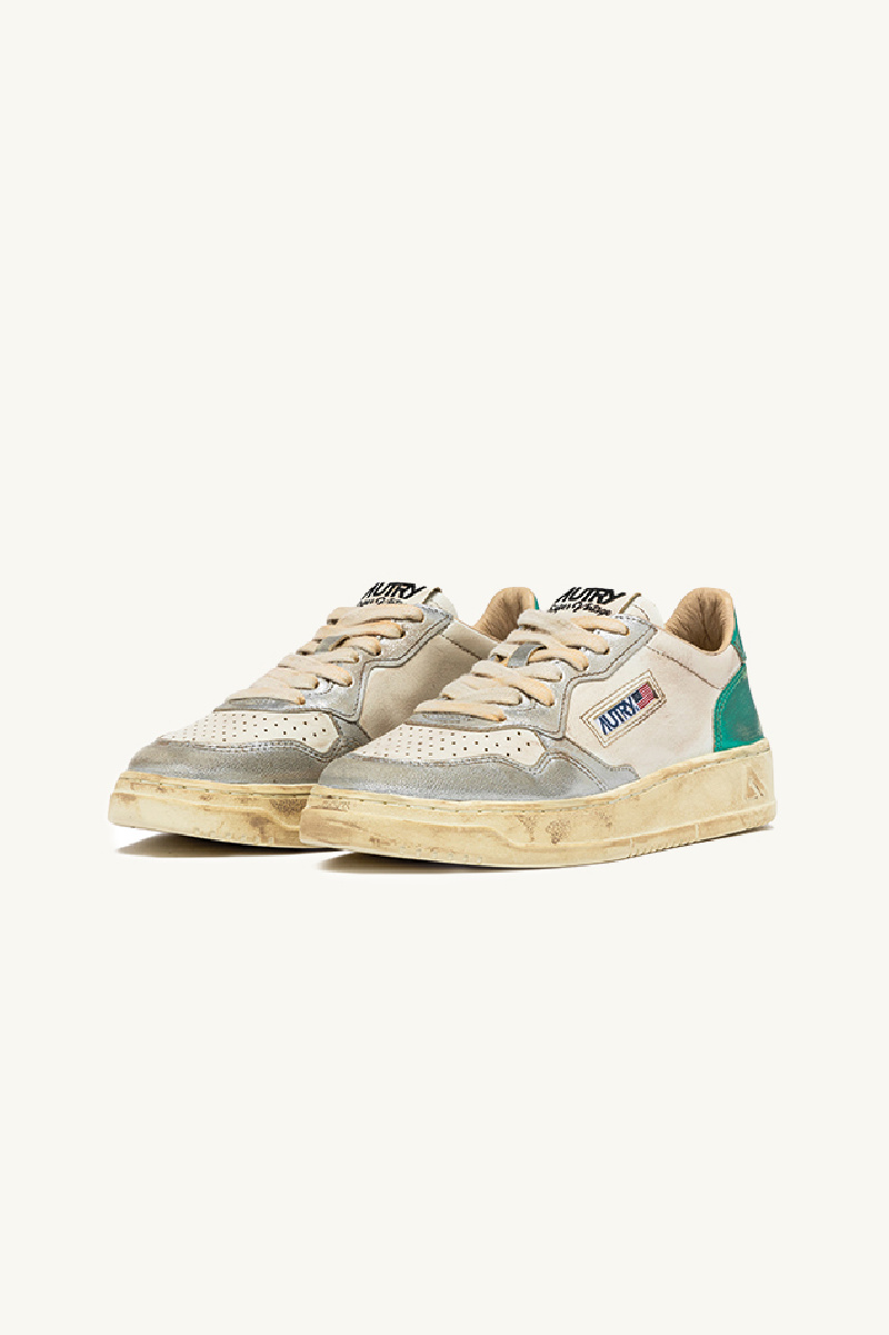 Super-Vintage sneakers from Autry in white, silver and metalized green made of soft leather with aged effect.