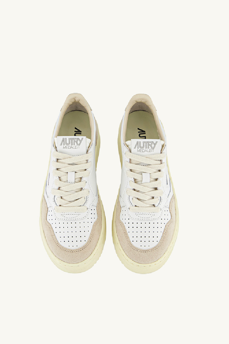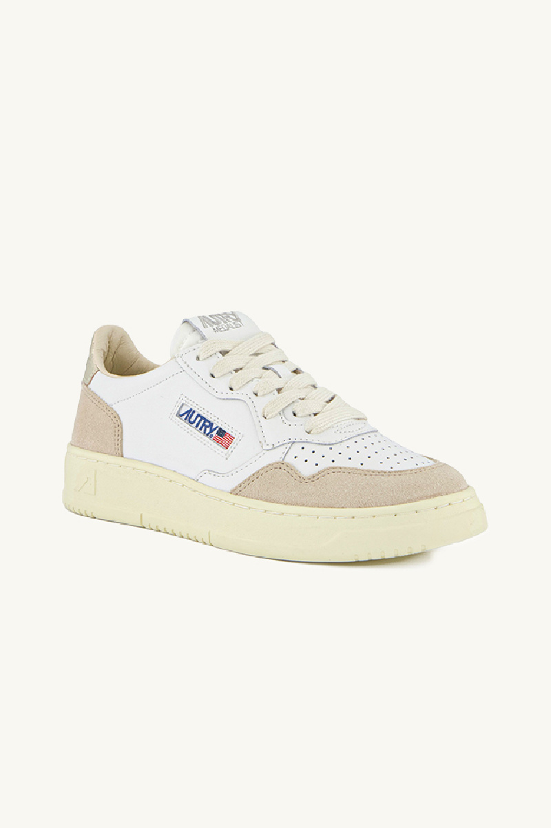 Pair of AUTRY, Medalist low sneakers, white crust leather, beige suede reinforcements, perforated forefoot, rubber sole, off-white cotton flat lace closure, fabric tongue with label, back leather detail in gold color.