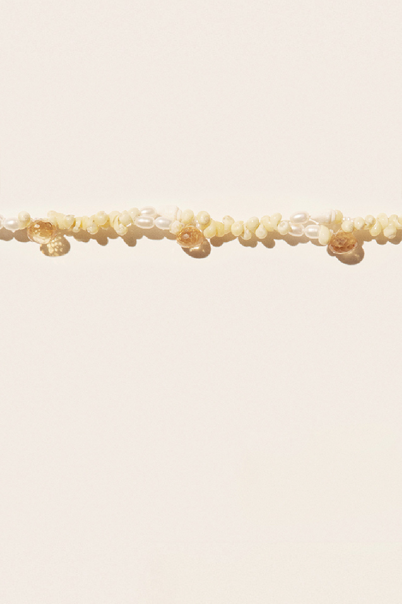 Collier ras de cou Nata fait de citrine, de coquillages, de perles baroques et de rocailles, de la marque Pascale Monvoisin. Bouton de nacre frappé du PM signature.