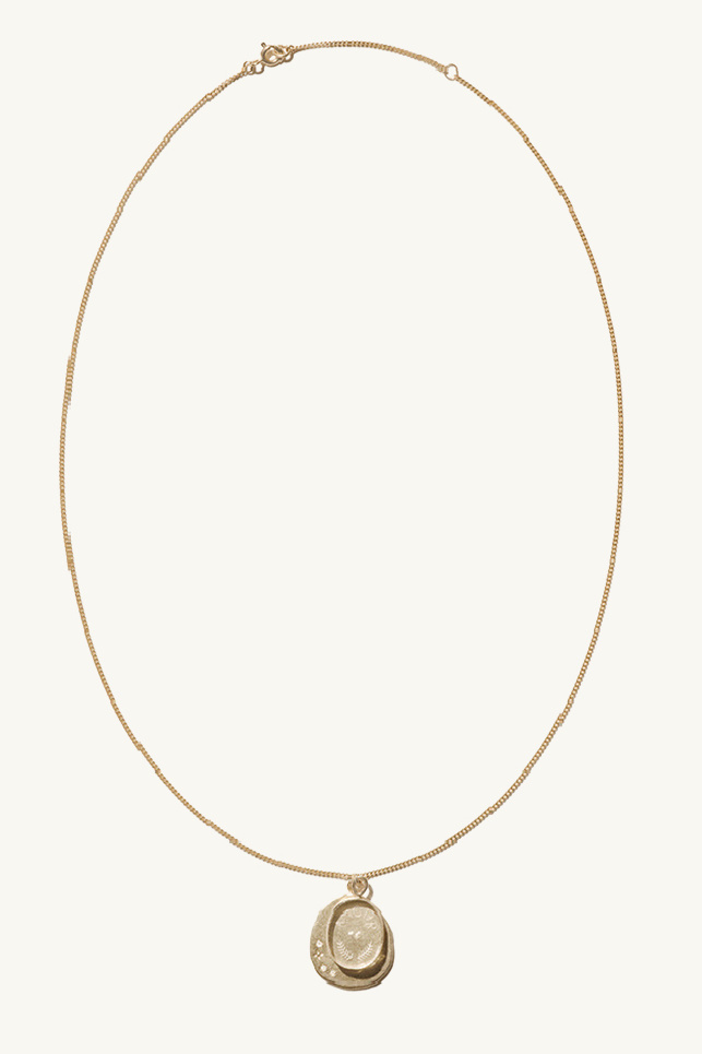 Collier l'Amour en or jaune 9 carats, cristal de roche et diamants de la marque Pascale Monvoisin. Gravure à la main.