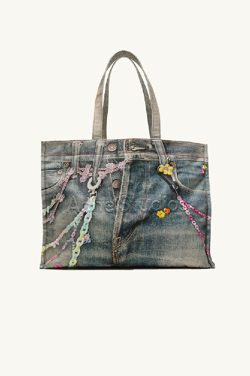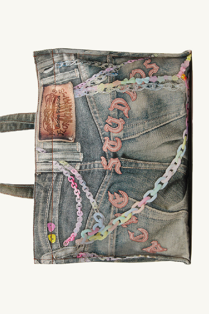 Sac fourre-tout confectionné dans une toile de coton en trompe-l’oeil impression denim, de la marque Acne Studios.