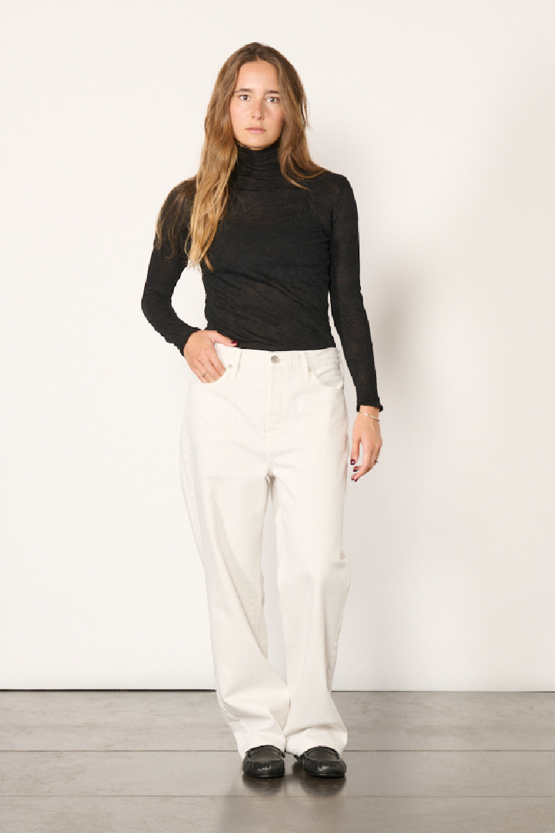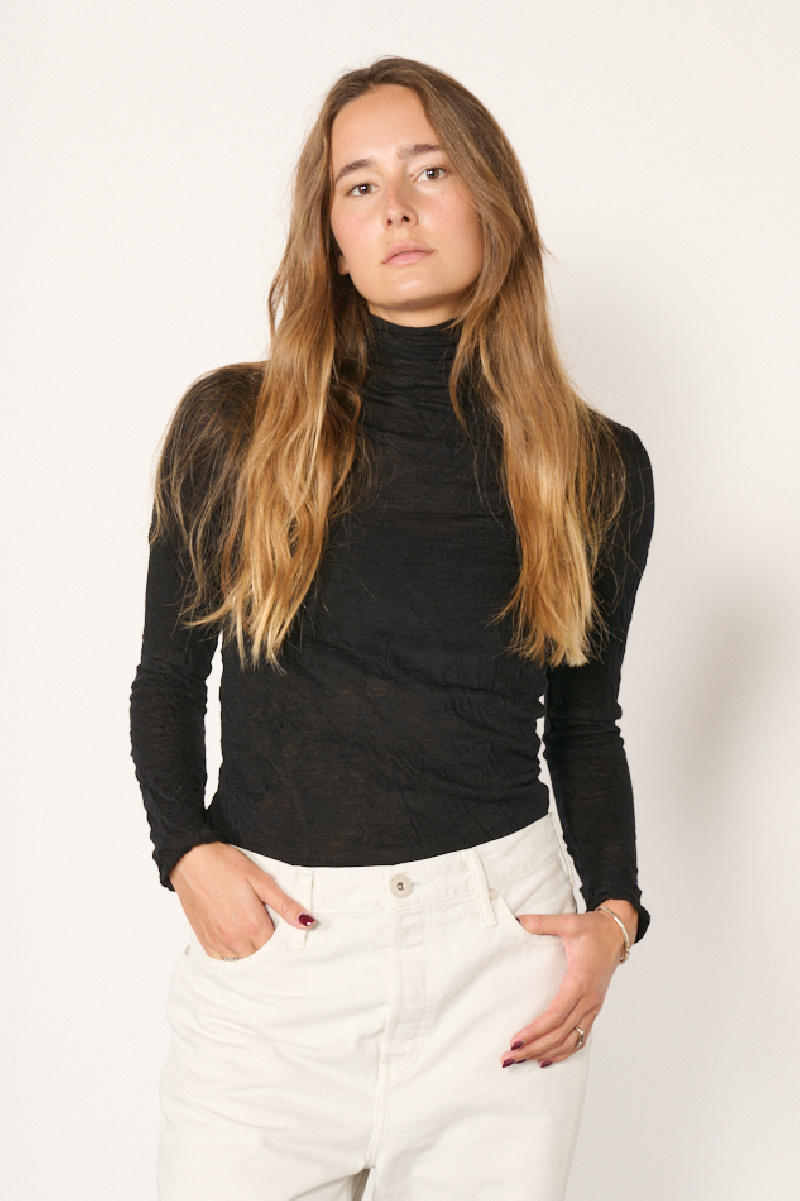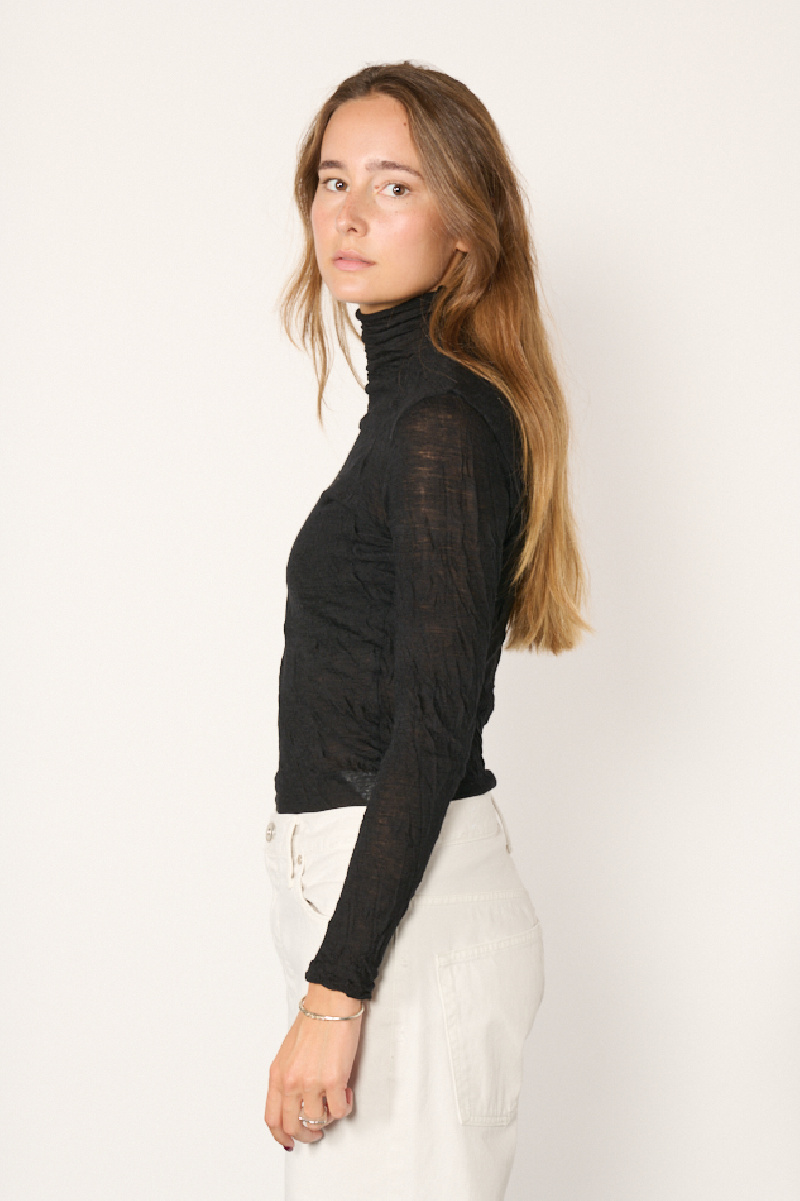 Col roulé confectionné en gaze de laine crêpée noire, offrant une légère transparence, de la marque Pas de Calais.