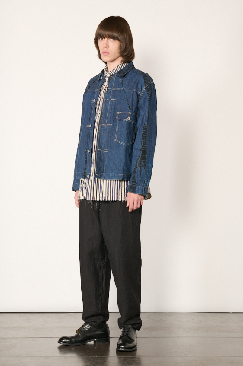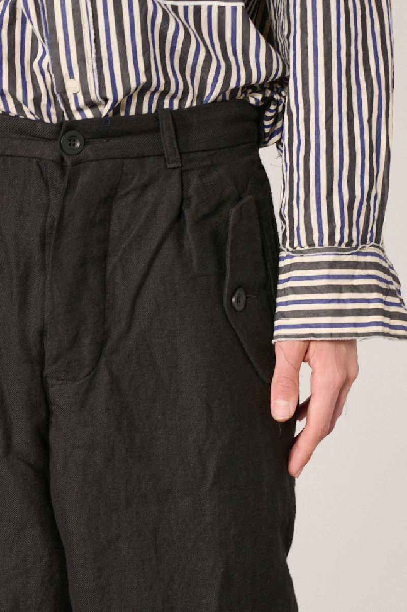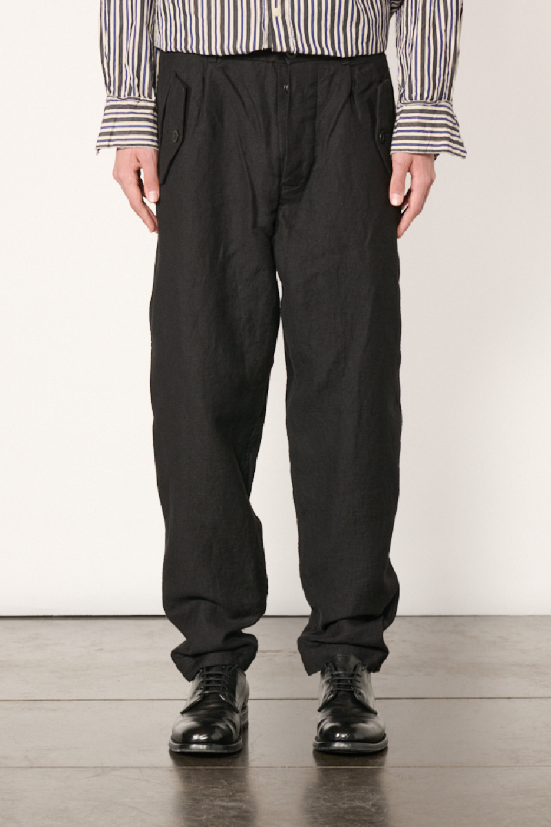 Pantalon Hiroshi noir confectionné dans un mélange de lin et de laine vierge, légèrement texturé et partiellement doublé, de la marque Casey Casey.