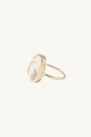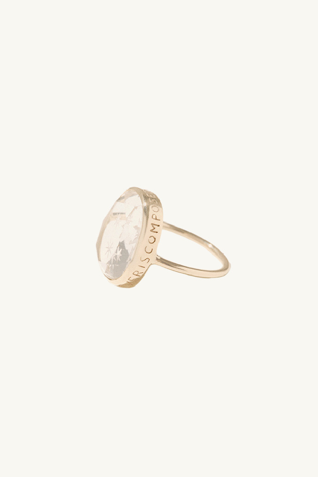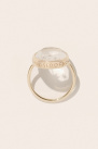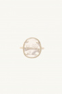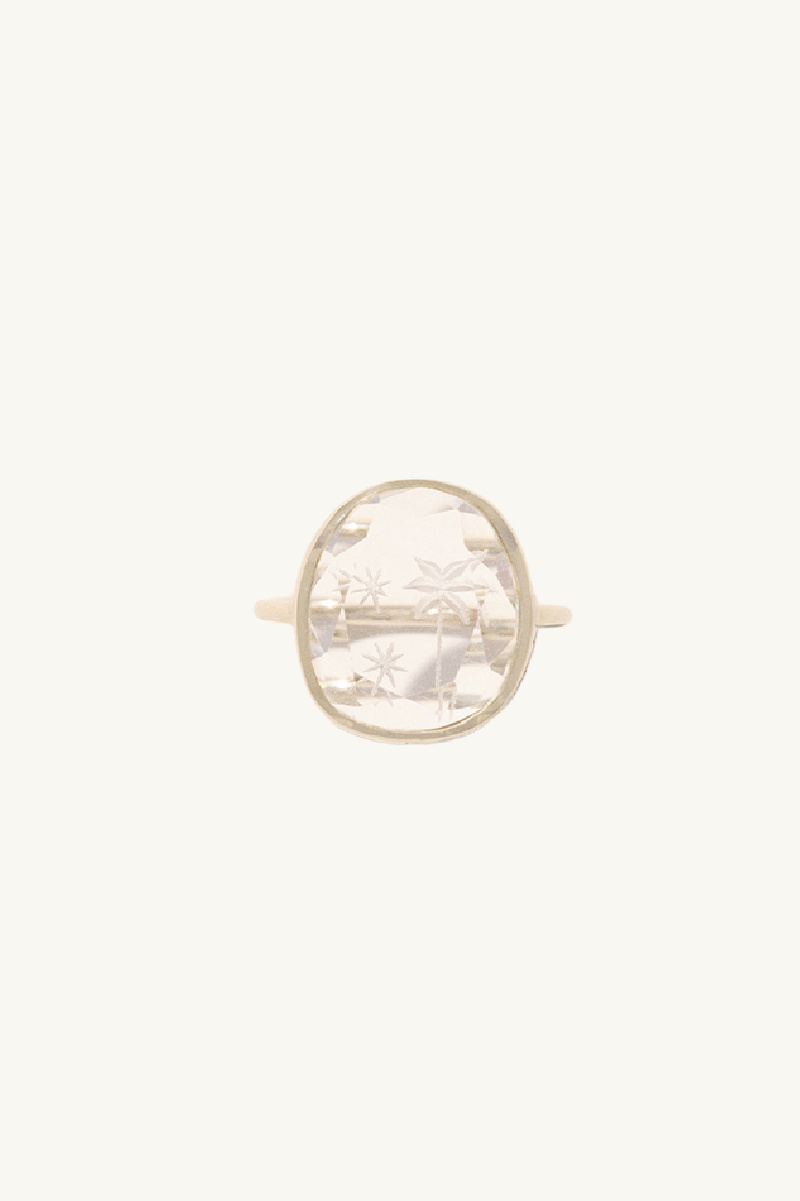 Pascale Monvoisin signe ici une pièce poétique et précieuse : le médaillon Alba, en or jaune 9 carats (375‰), met à l’honneur le cristal de roche, pierre chère à la créatrice. Chaque exemplaire, unique par ses nuances, est gravé d’un délicat palmier et orné de la citation d’Emily Dickinson « Forever is composed of nows », célébrant la beauté de l’instant.