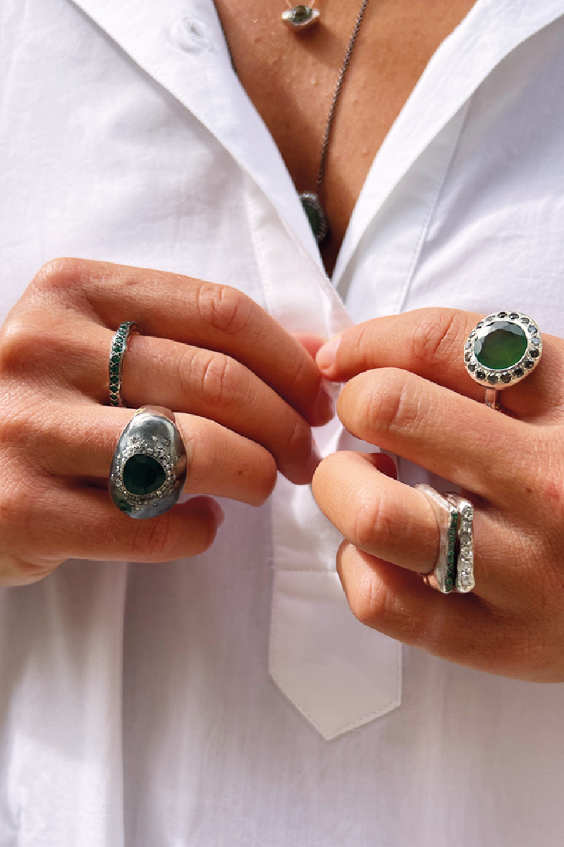 Bague Riny F1 S ST DIA, Rosa Maria en argent sertie d'emeraude. Les bijoux de la marque Rosa Maria sont un mélange audacieux entre inspirations ethniques et esprit industriel brut.