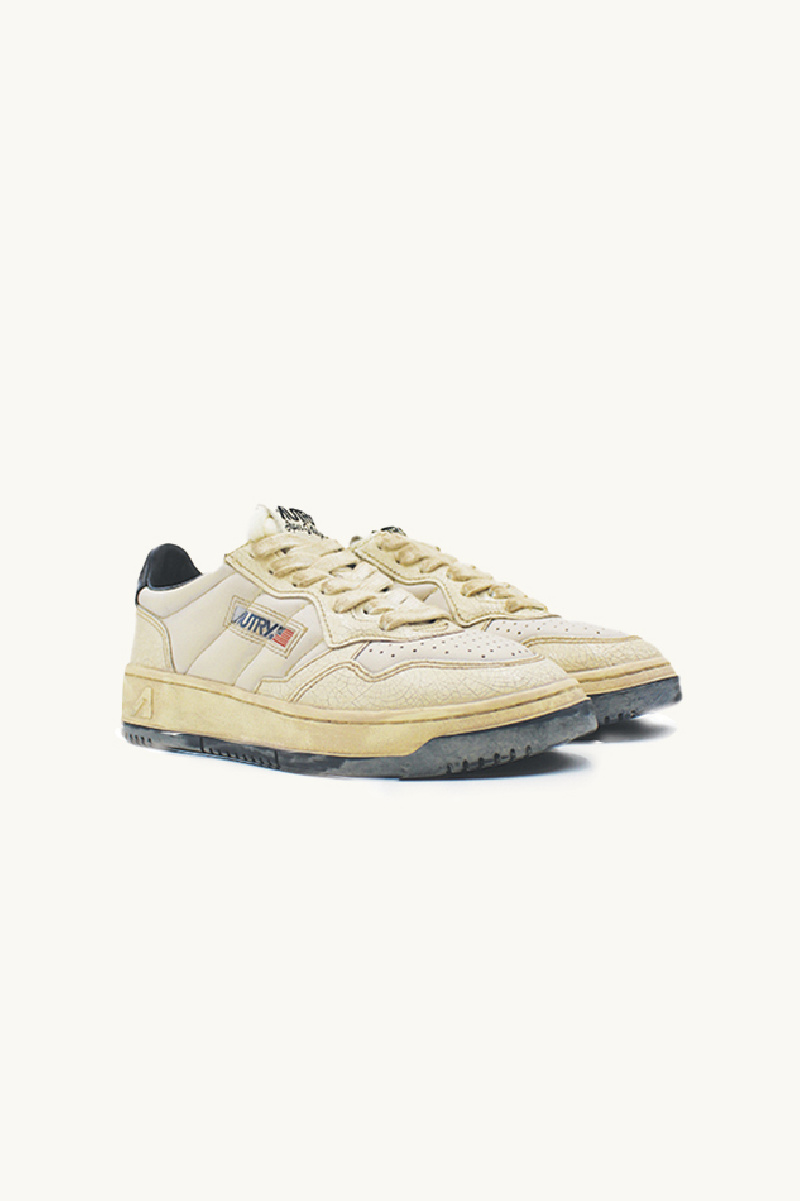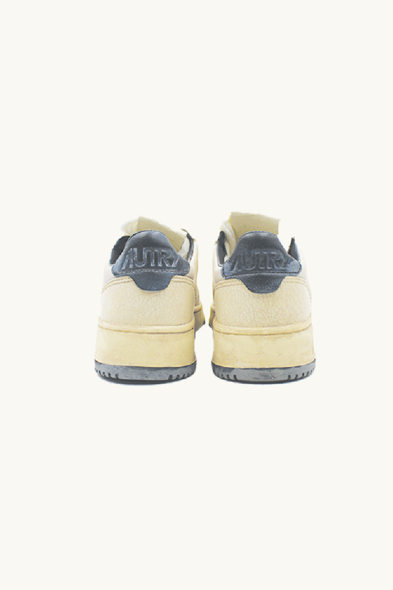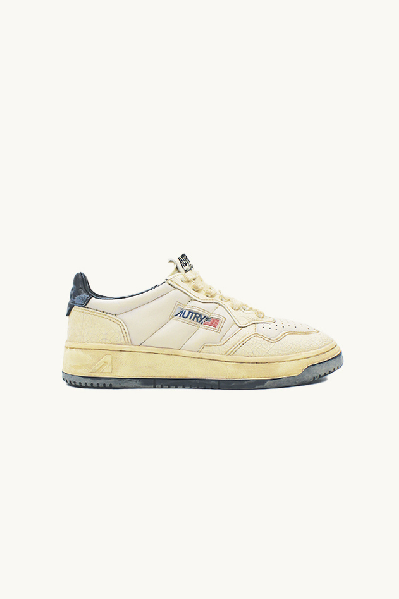 Basket Autry en cuir, asperge et bleu foncé, effet vieilli et matelassé, avant-pied perforé, semelle en caoutchouc écrue, fermeture à lacets, languette en tissu avec étiquette, contrefort rembourré.