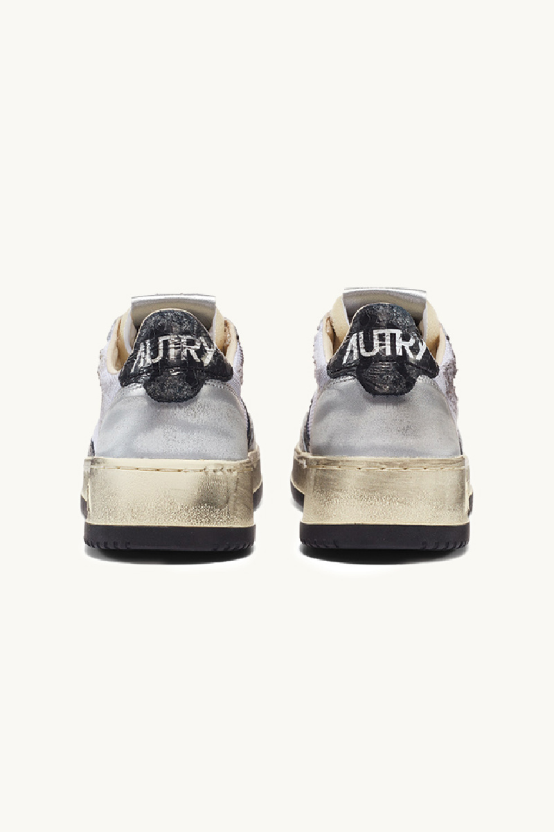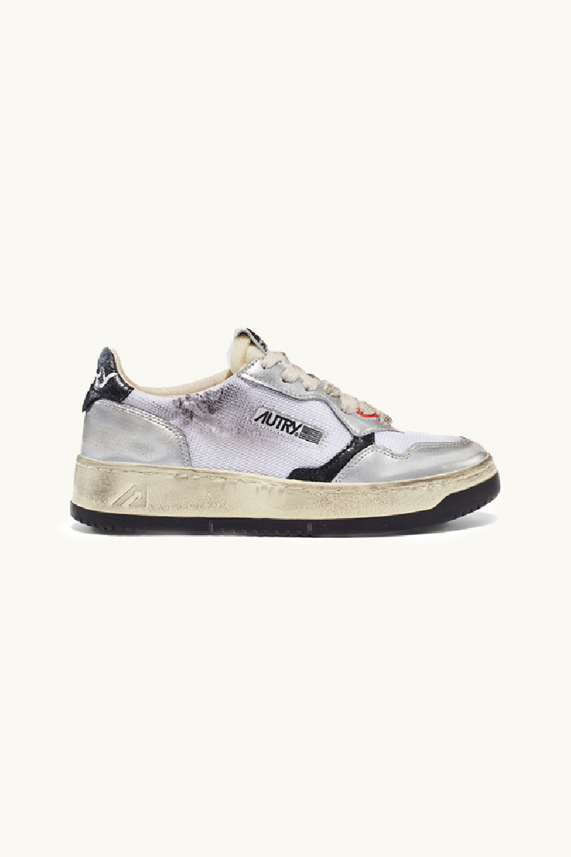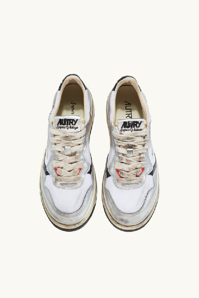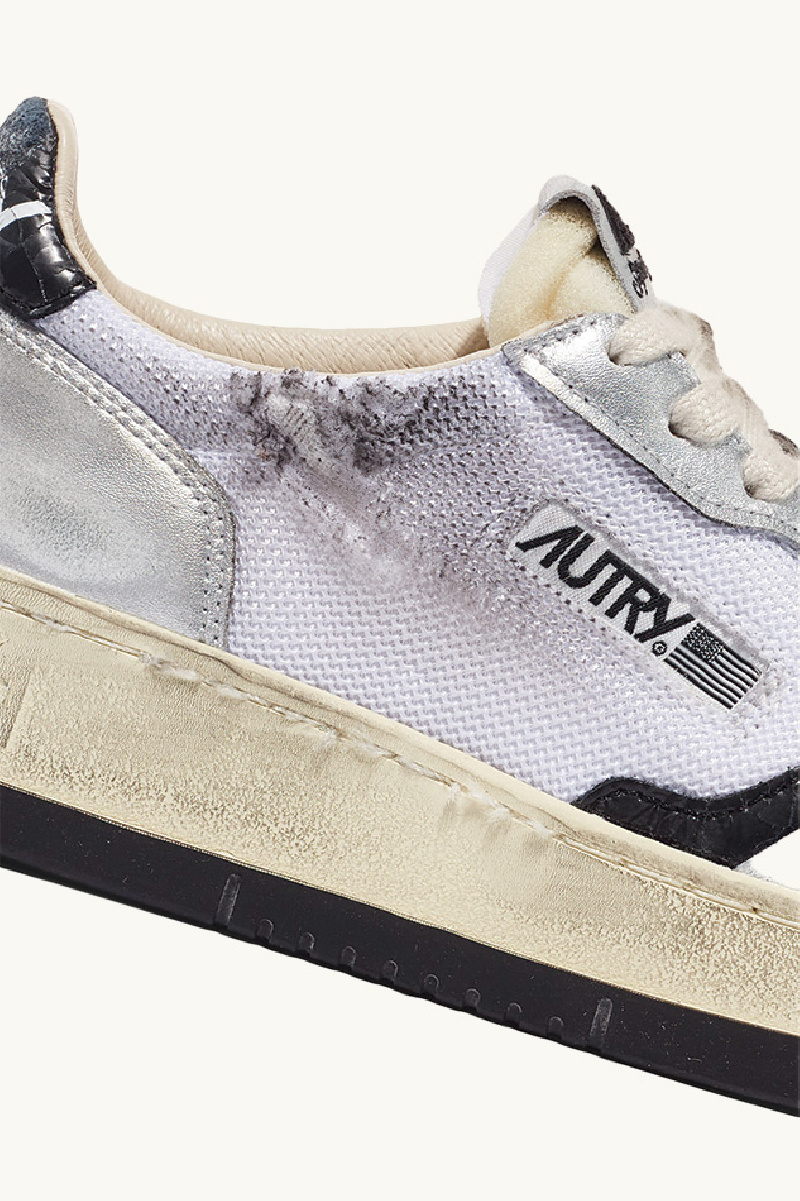Basket Femme, Autry vintage low en cuir et tissu tricolore blanc, noir et argent avec Détail rouge sur l'avant. Semelle en caoutchouc, fermeture à lacets, languette en tissu avec étiquette, contrefort rembourré.