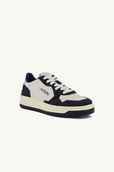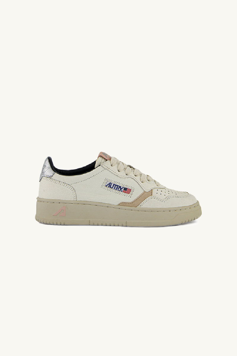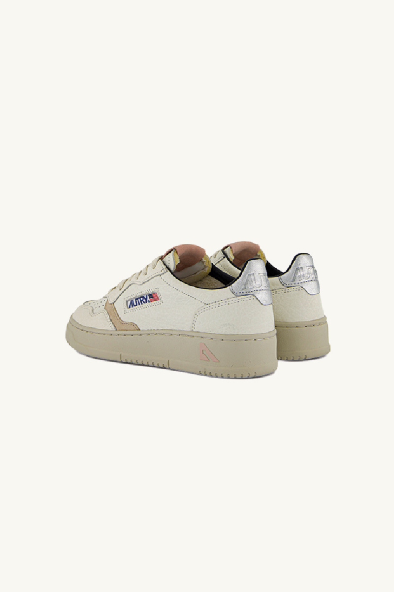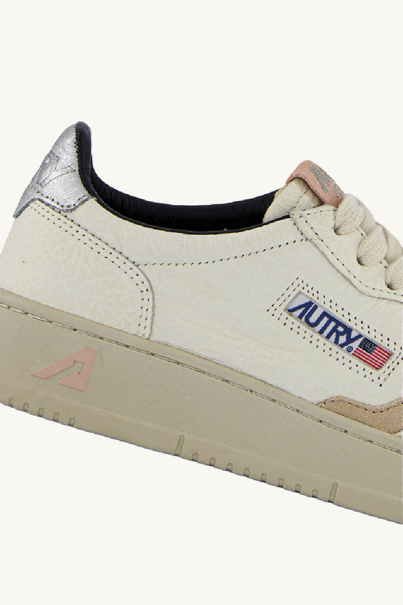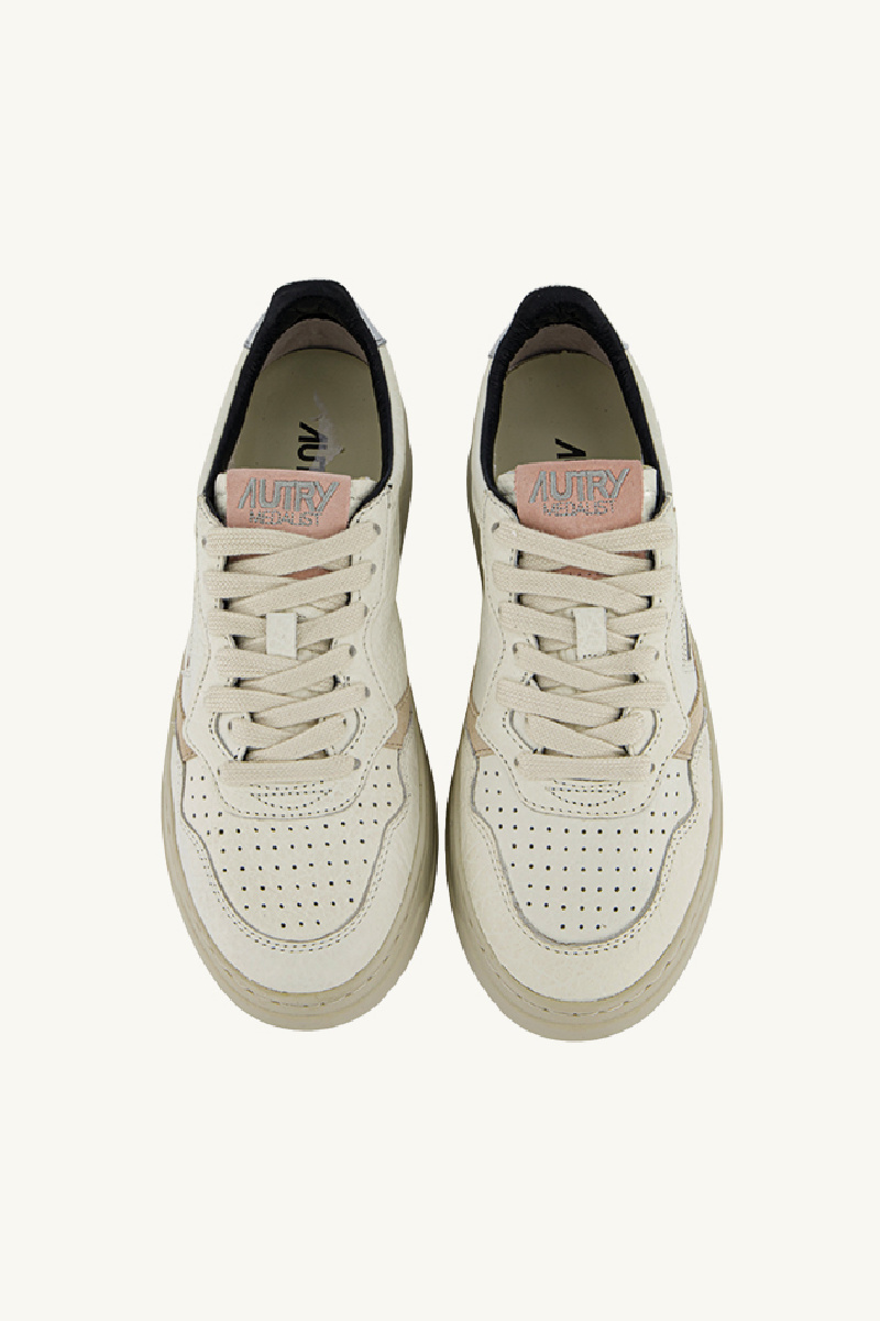 Paire de baskets AUTRY, modèle Medalist LOW en cuir, proposée en couleur blanc et rose, avant pied perforé, semelle caoutchouc, fermeture à lacets en coton. Languette avant rose et languette arrière argentées.