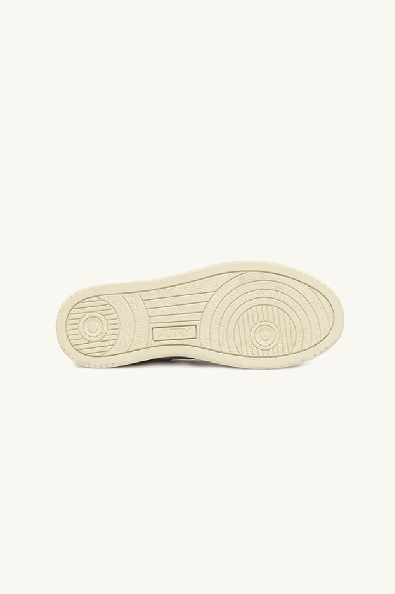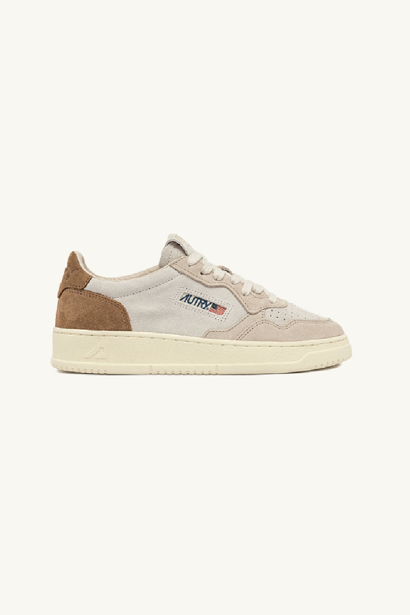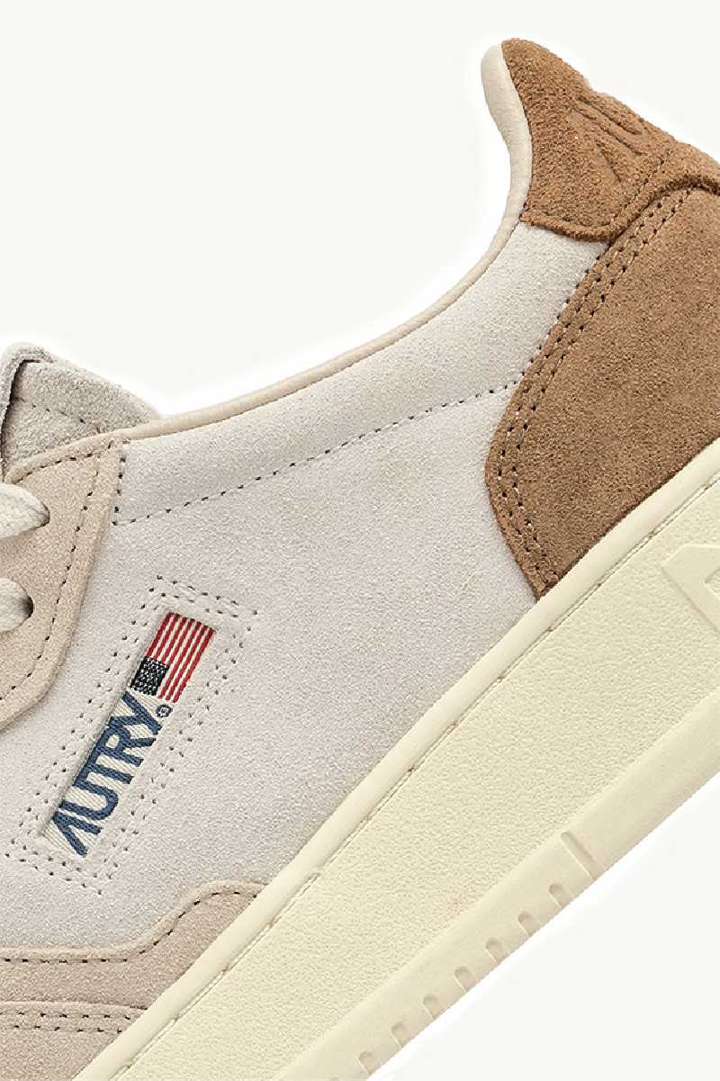 Paire de baskets AUTRY, Medalist low, écru, en daim. Renforts en daim beige, avant-pied perforé, semelle en caoutchouc, fermeture à lacets plats en coton blanc cassé, languette en tissu avec étiquette, détail arrière en daim couleur camel.