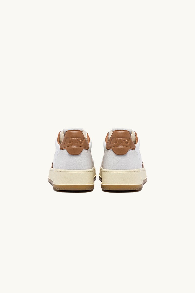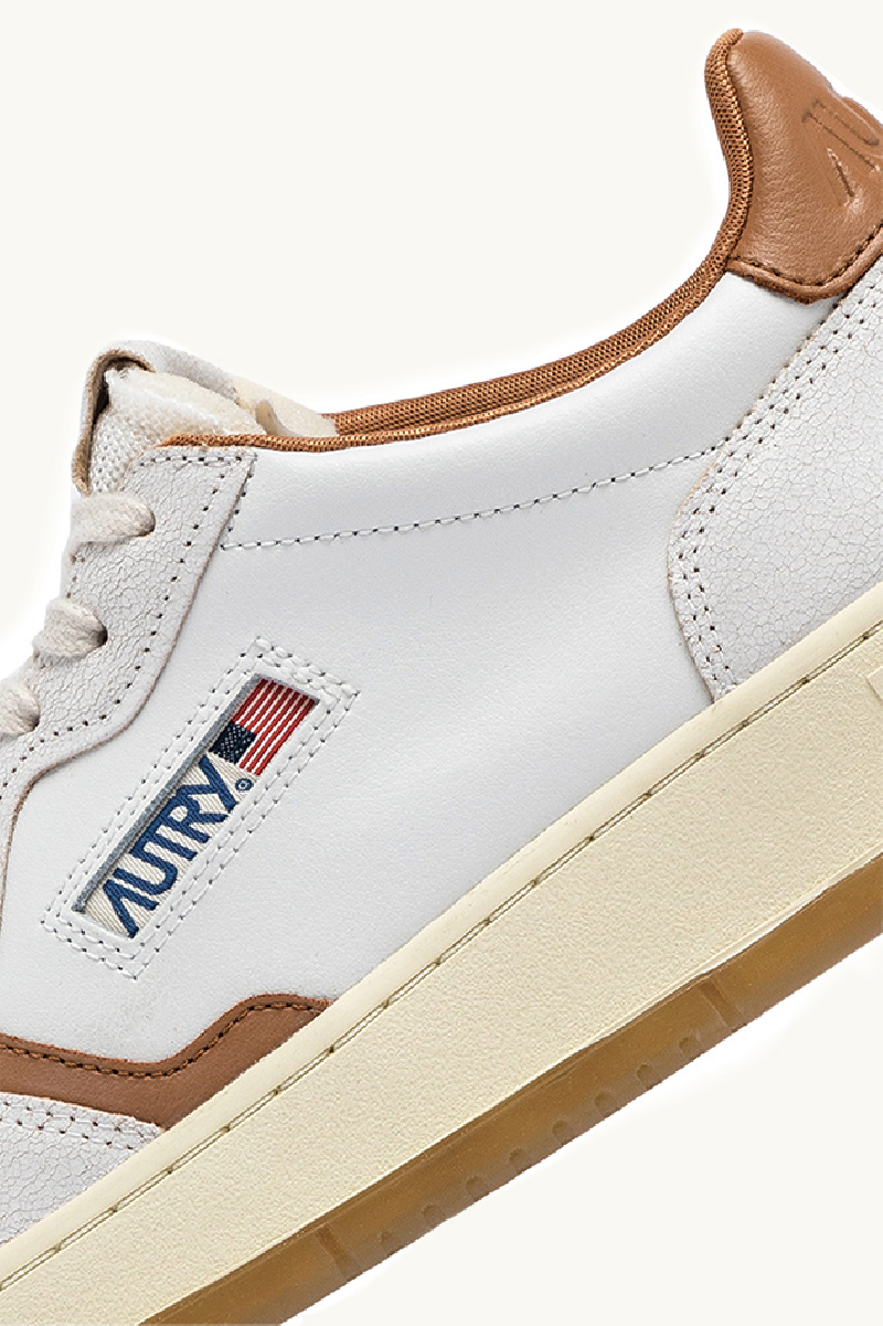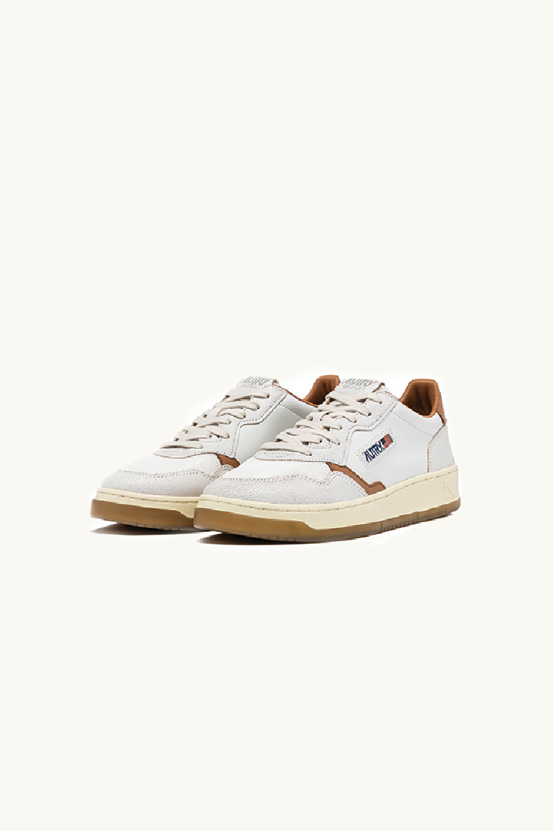 Paire de baskets AUTRY, modèle Medalist Low en cuir, proposée en couleur blanc, détails marron, et effet craquelés avant-pied perforé, semelle caoutchouc, fermeture à lacets en coton. Languette arrière marron.