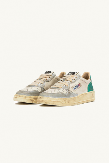 Baskets Autry vintage en cuir souple tricolore blanc, vert armée et argent métallisé, à effet vieilli.