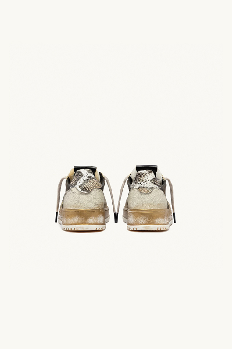 Elles offrent un effet vintage avec le cuir blanc craquelé et le mesh noir vieilli, ainsi que des taches de peinture dorées notamment sur la semelle et l'avant de la chaussure. Elle possède également une fermeture à lacets en coton ainsi qu'un contrefort motif phyton.