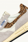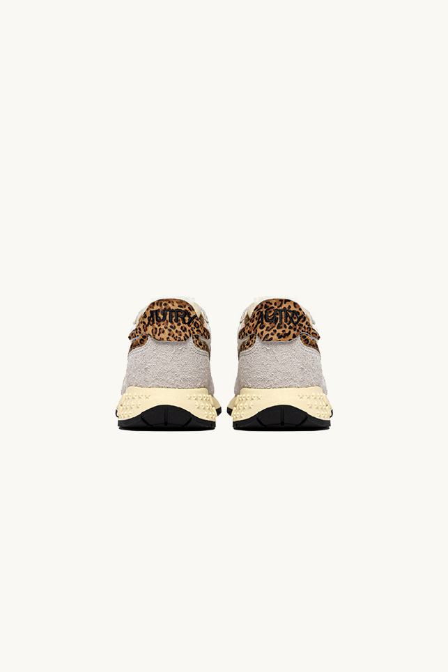 Elles présentent des empiècements en faux poil de poney à motif léopard sur les côtés et le contrefort, un avant-pied en mesh, ainsi qu’une fermeture à lacets en coton. Le logo brodé en noir orne le contrefort.