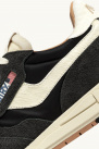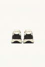 Elles présentent des empiècements en faux poils de poney blancs sur les côtés, la languette et le contrefort, une semelle en caoutchouc ainsi qu’une fermeture à lacets en coton. Le contrefort est orné du logo de la marque, brodé en beige.
