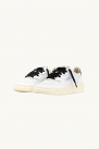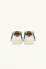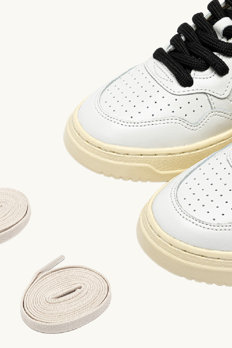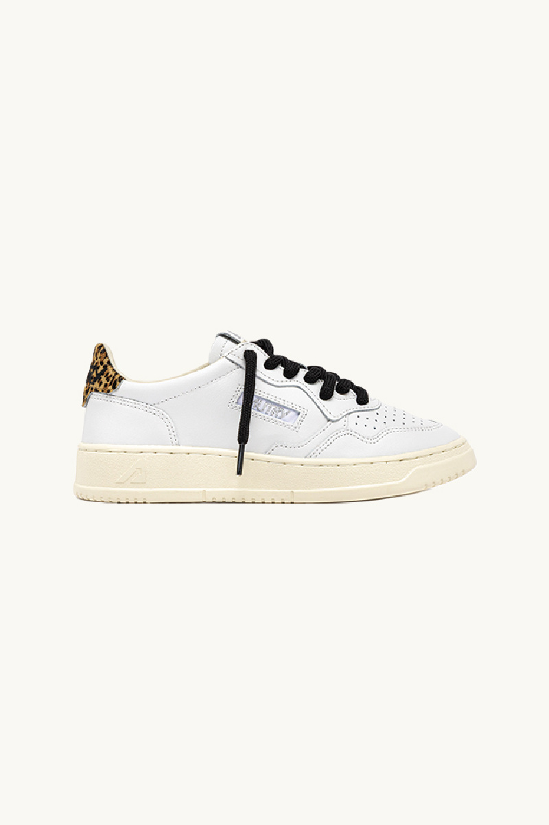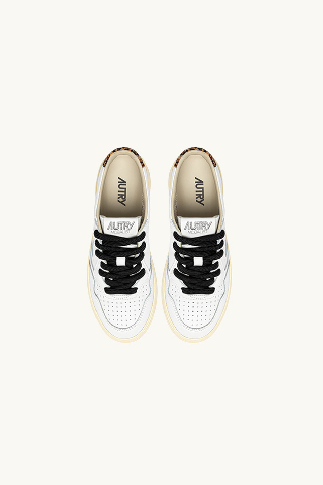 Le modèle est complété par des lacets en coton, livrés en deux paires (noire et blanche), un contrefort en faux poils léopard souligné du logo emblématique de la marque, ainsi que le petit logo iconique Autry sur le côté de la chaussure, décliné en paillettes argentées sur ce modèle.