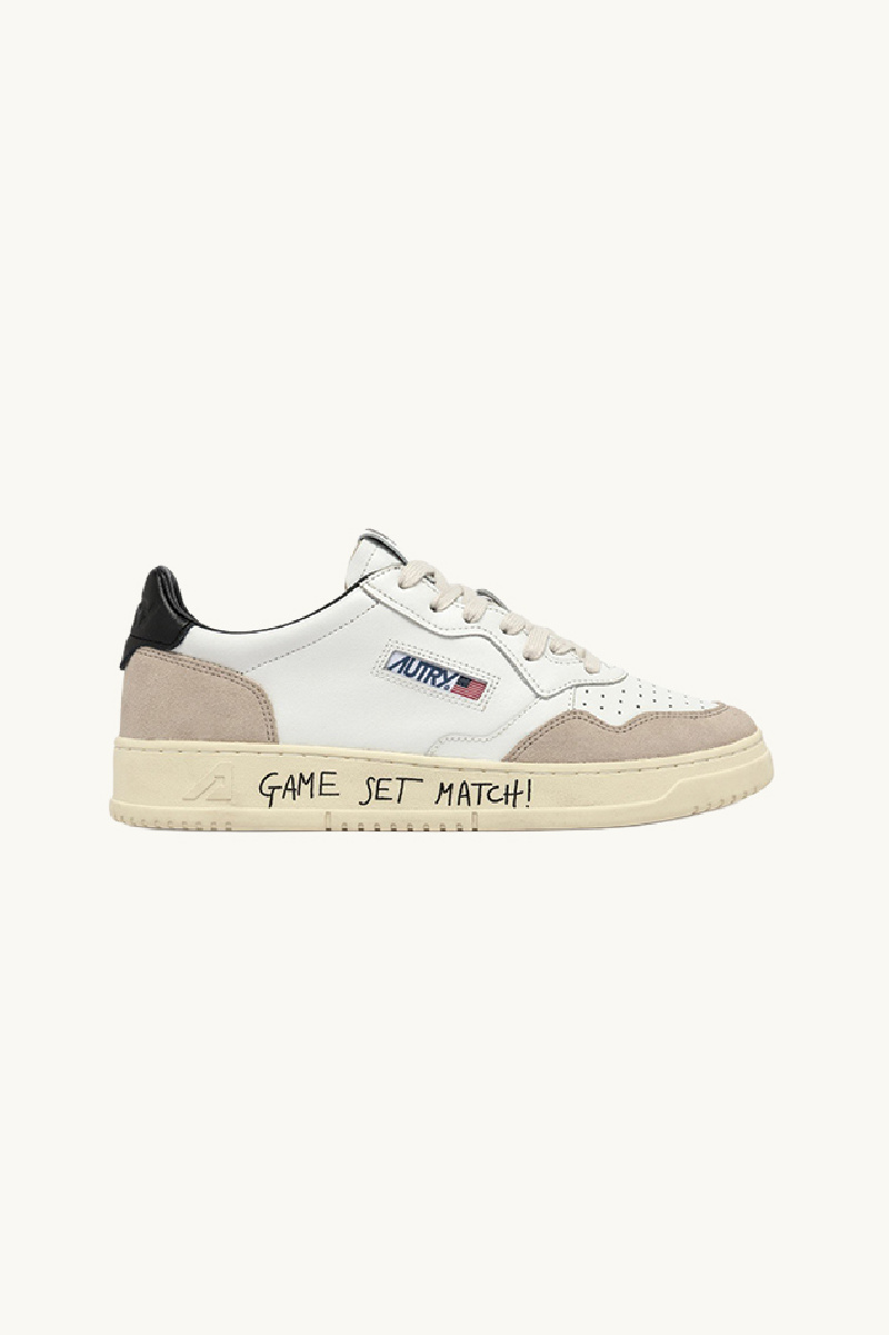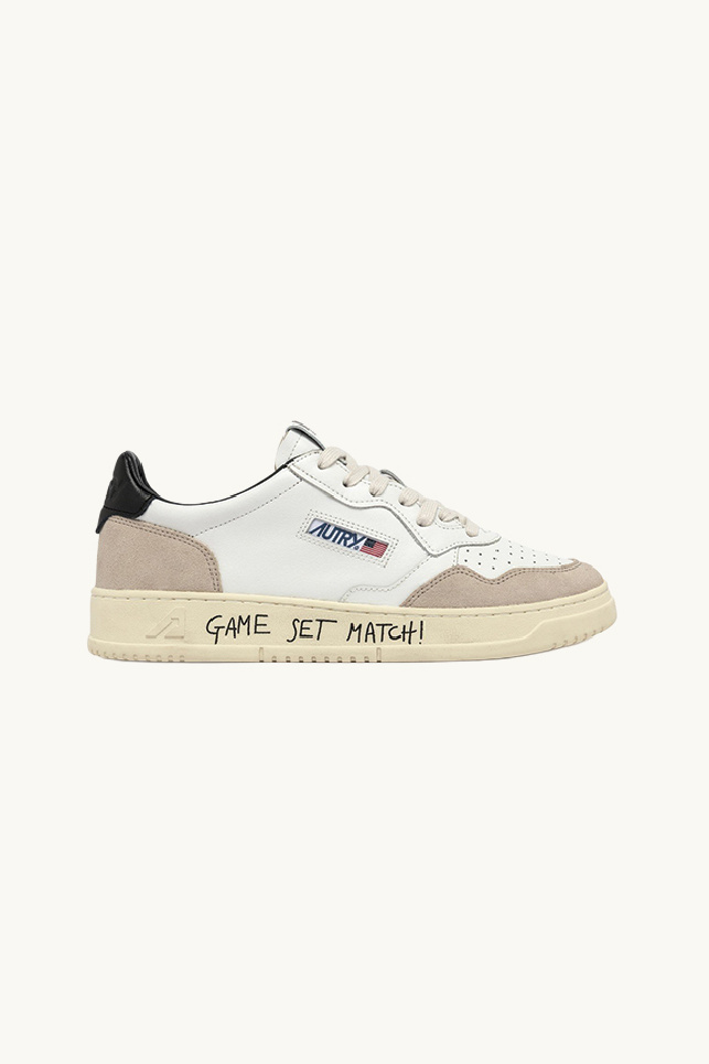 Elles présentent des empiècements en daim beiges, un avant-pied perforé et une semelle en caoutchouc marquée de l’inscription “Game Set Match”.