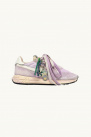 Le design est complété par une fermeture à double lacets blancs et lila , des semelles épaisses en caoutchouc et des breloques colorés.