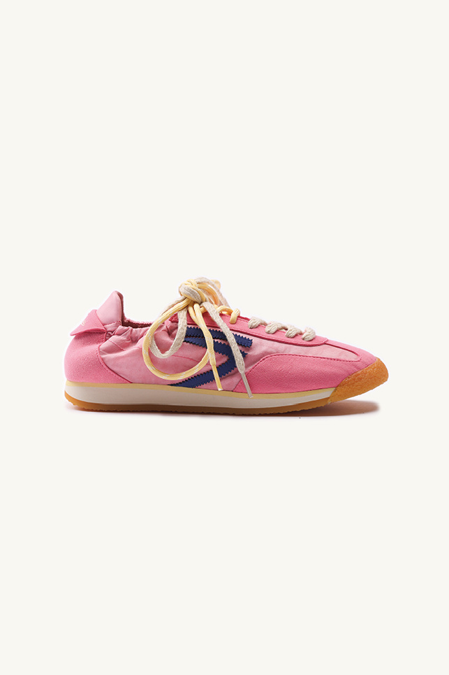 Le modèle est complété par un double laçage aux couleurs contrastées, une semelle extérieure en caoutchouc, ainsi qu’un contrefort en cuir végétal rose.