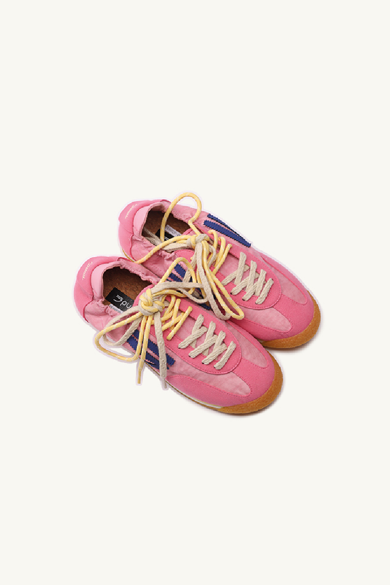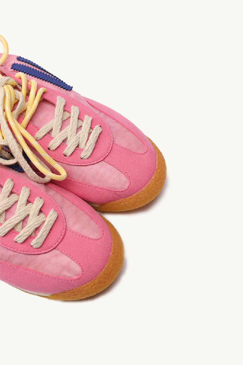 Baskets Panther roses, coloris Macaron, de la marque Puraai, confectionnées en nylon et micro-suède végétalien.