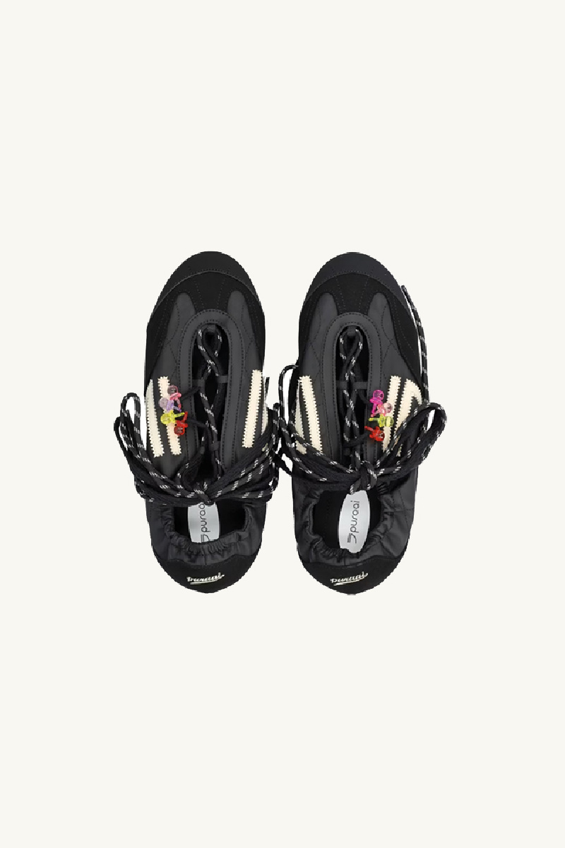 Confectionnées en cuir vegan, elles se distinguent par une construction matelassée, une ouverture sur le haut, un système distinctif à double laçage noir et blanc avec charms amovibles, et des empiècements en microsuède ton sur ton.