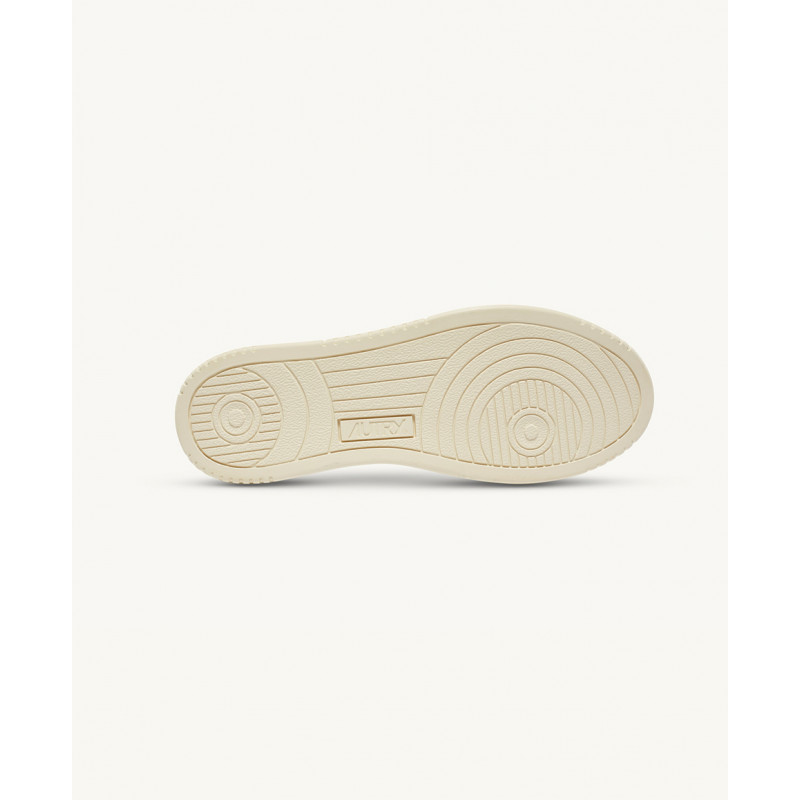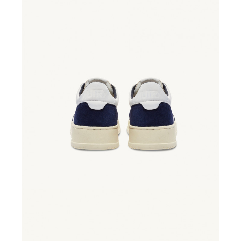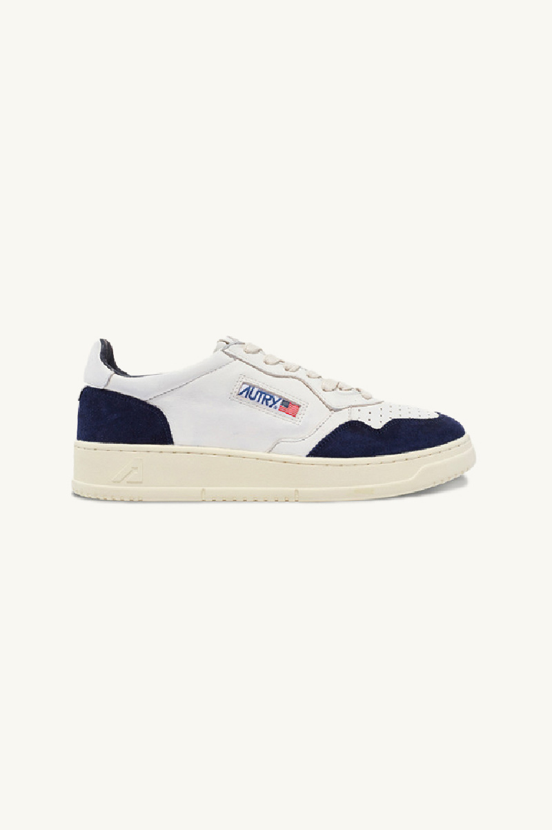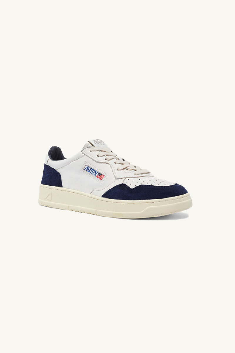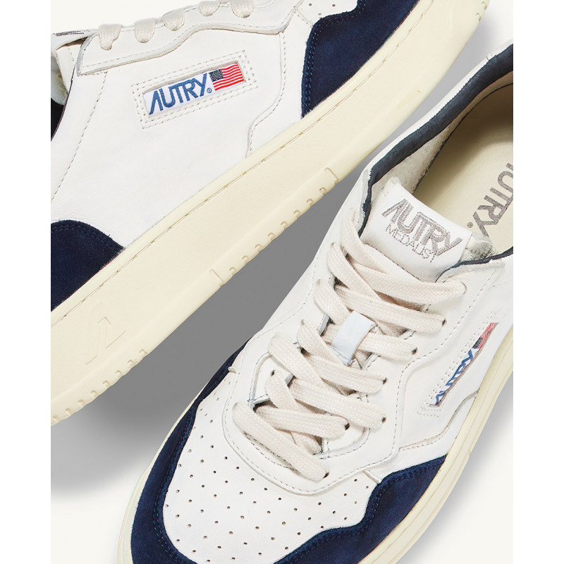 Paire de baskets AUTRY, Medalist low, blanc et bleu marine, en cuir blanc avec empiècements bleu marine arrière, avant-pied perforé, semelle en caoutchouc, fermeture à lacets plats en coton blanc, languette en tissu avec étiquette, contrefort rembourré.