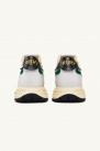 Baskets Reelwind Low de la marque Autry, blanches avec détails verts en cuir et nylon, semelle extérieure en caoutchouc et phylon ultra-léger, offre confort et légèreté, contrefort noir et doré, étiquette brodée sur la languette.
