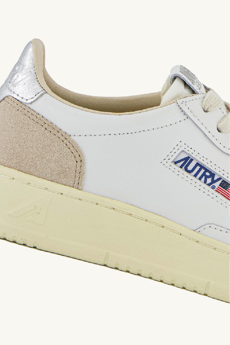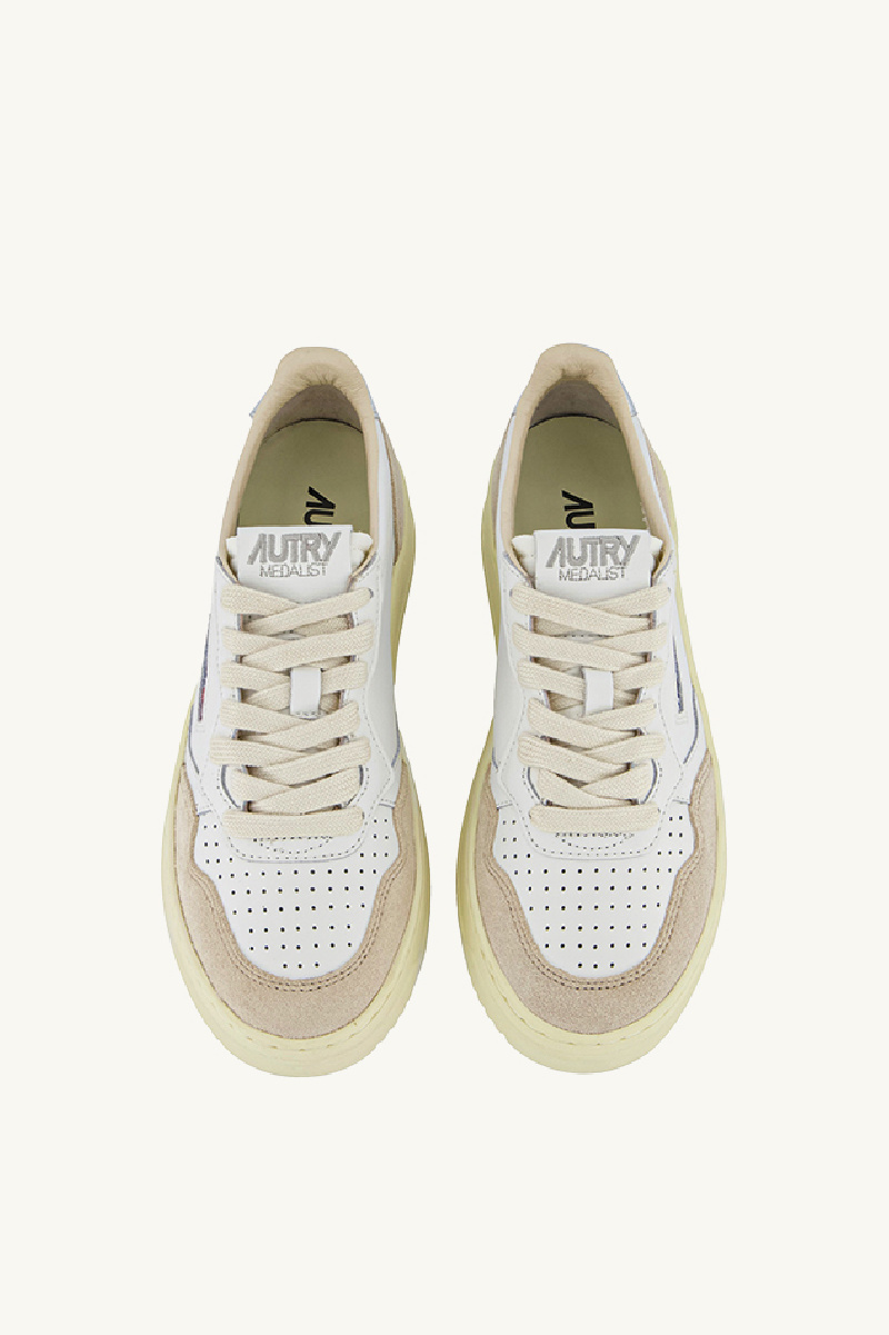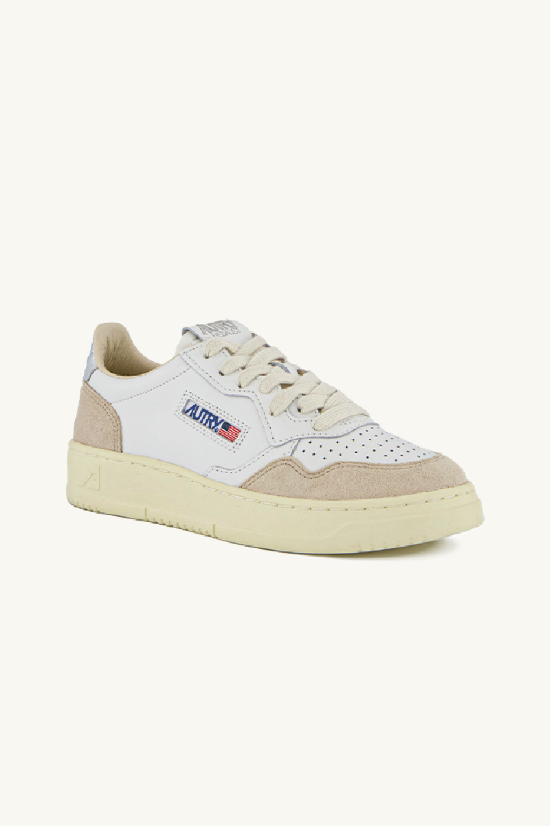 Paire de baskets AUTRY, Medalist low, blanche, en croute de cuir. Renforts en daim beige, avant-pied perforé, semelle en caoutchouc, fermeture à lacets plats en coton blanc, languette en tissu avec étiquette, détail arrière couleur argent.
