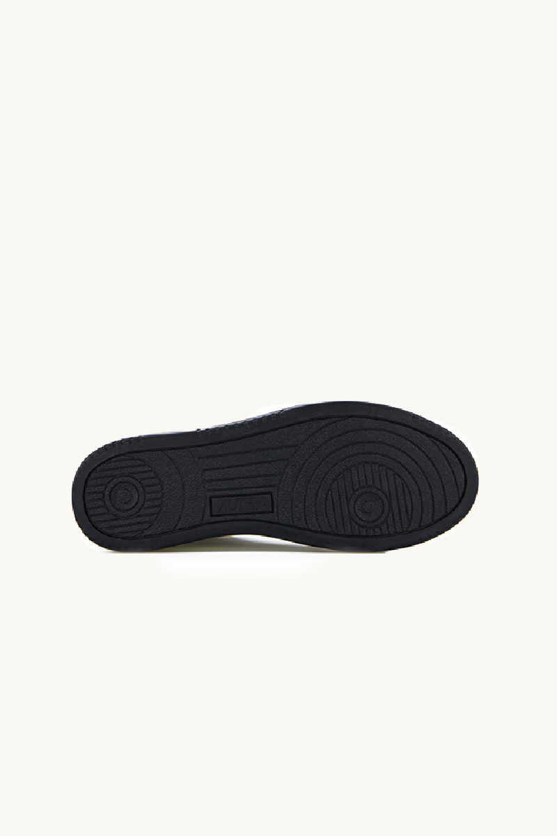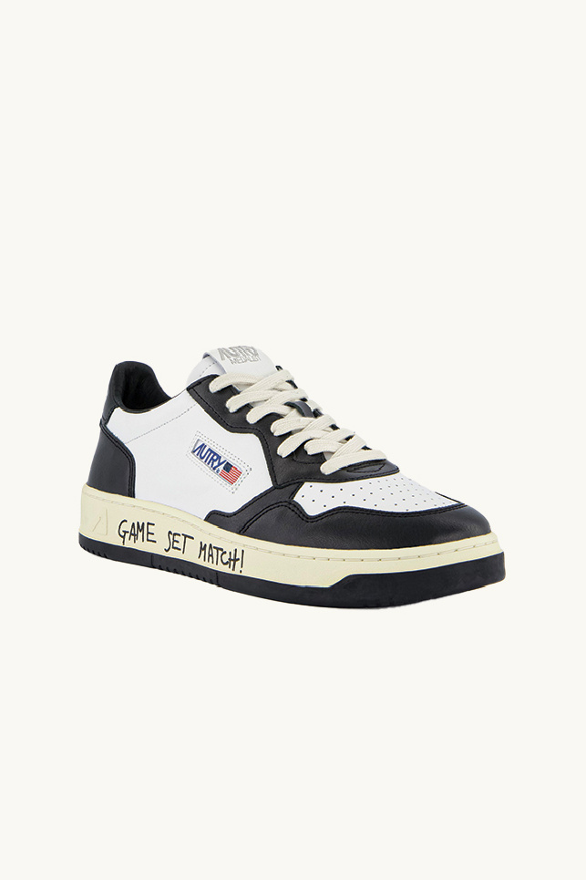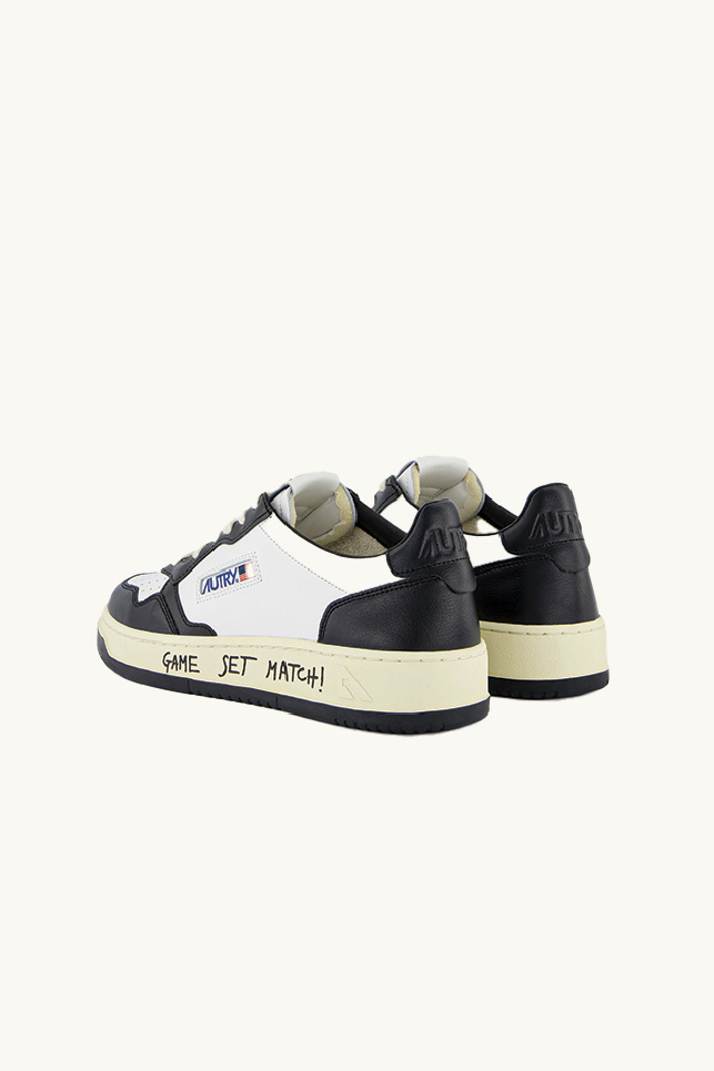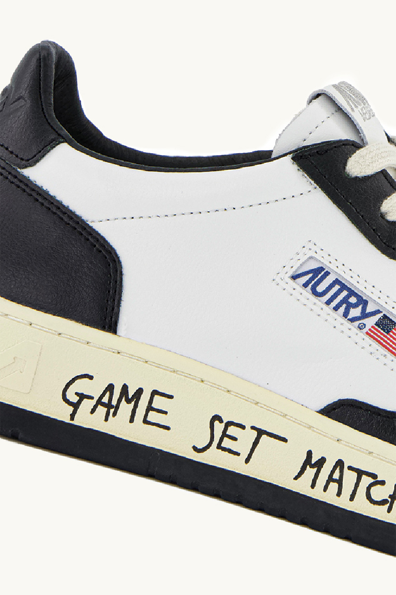 Elles présentent des empiècements en cuir noir, un avant-pied perforé et une semelle en caoutchouc marquée de l’inscription “Game Set Match”.