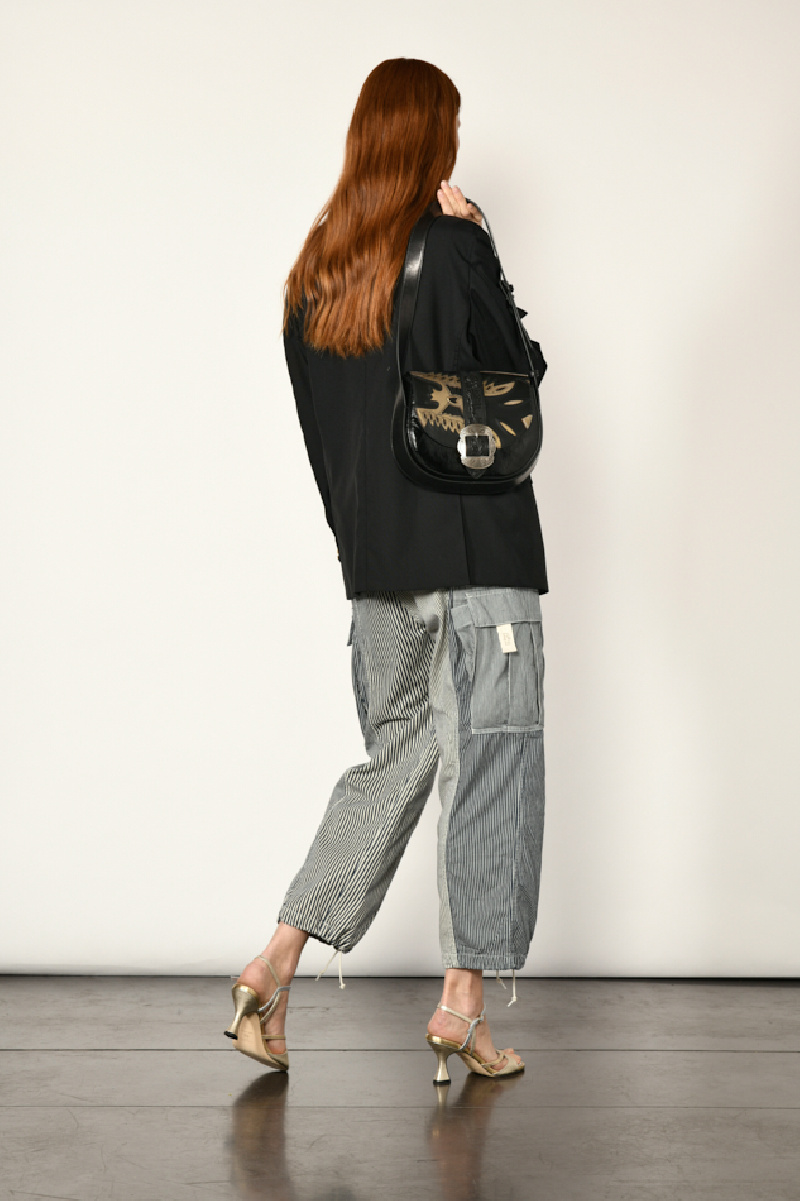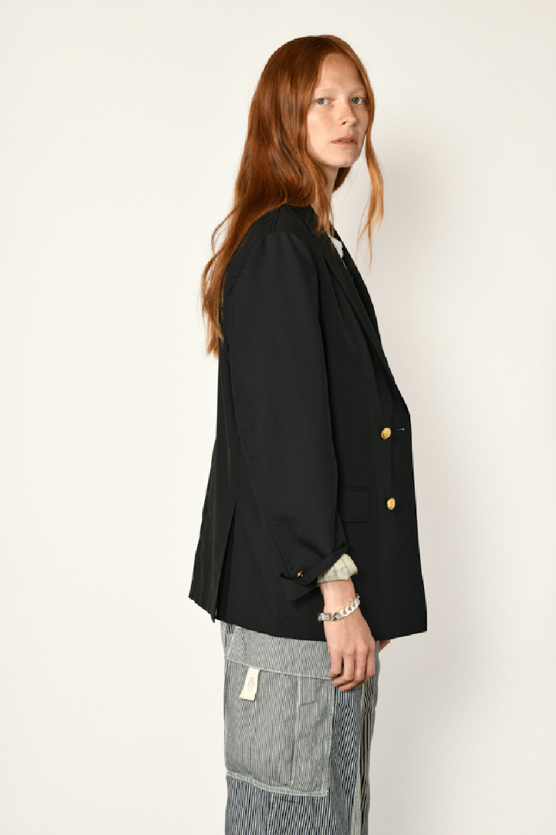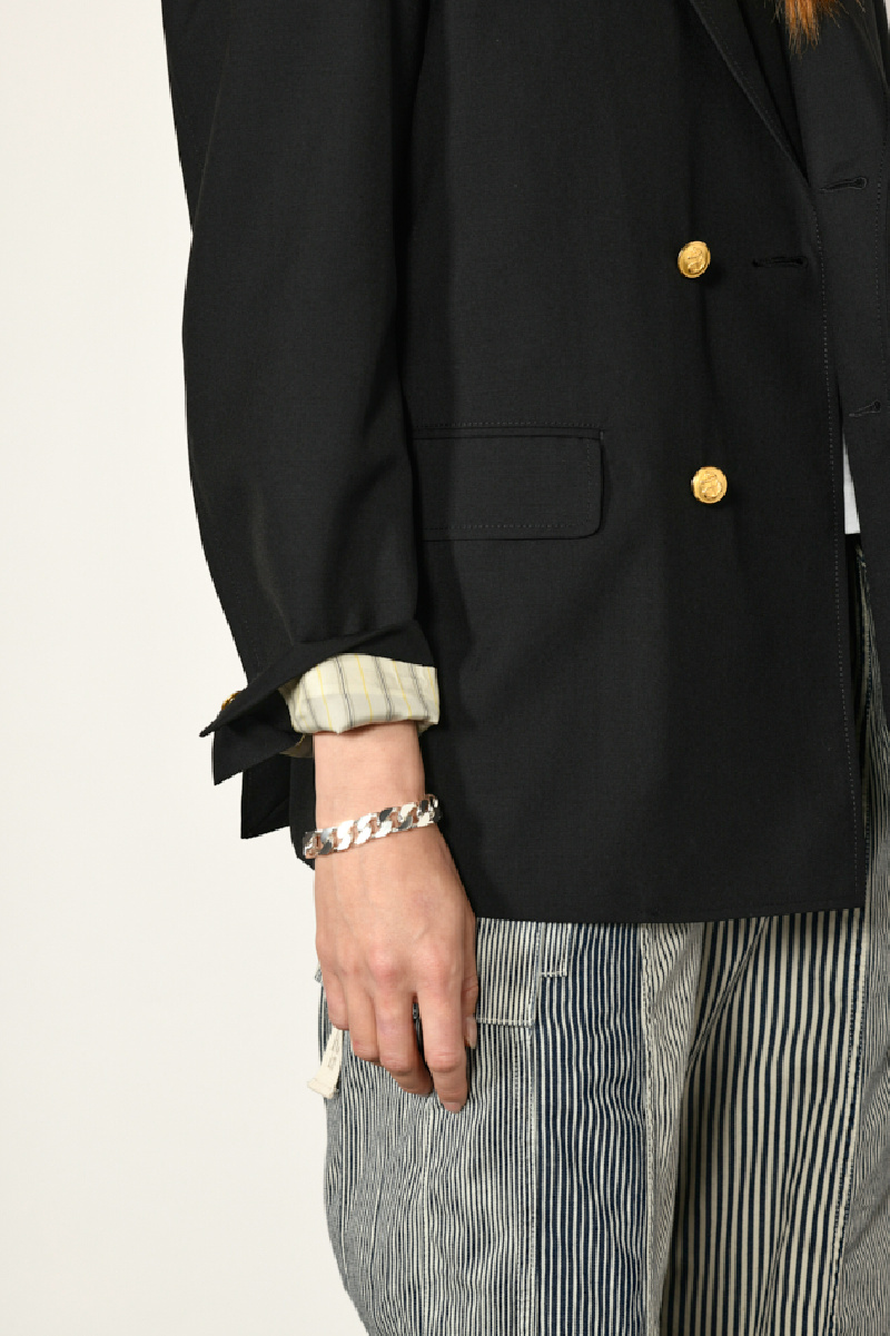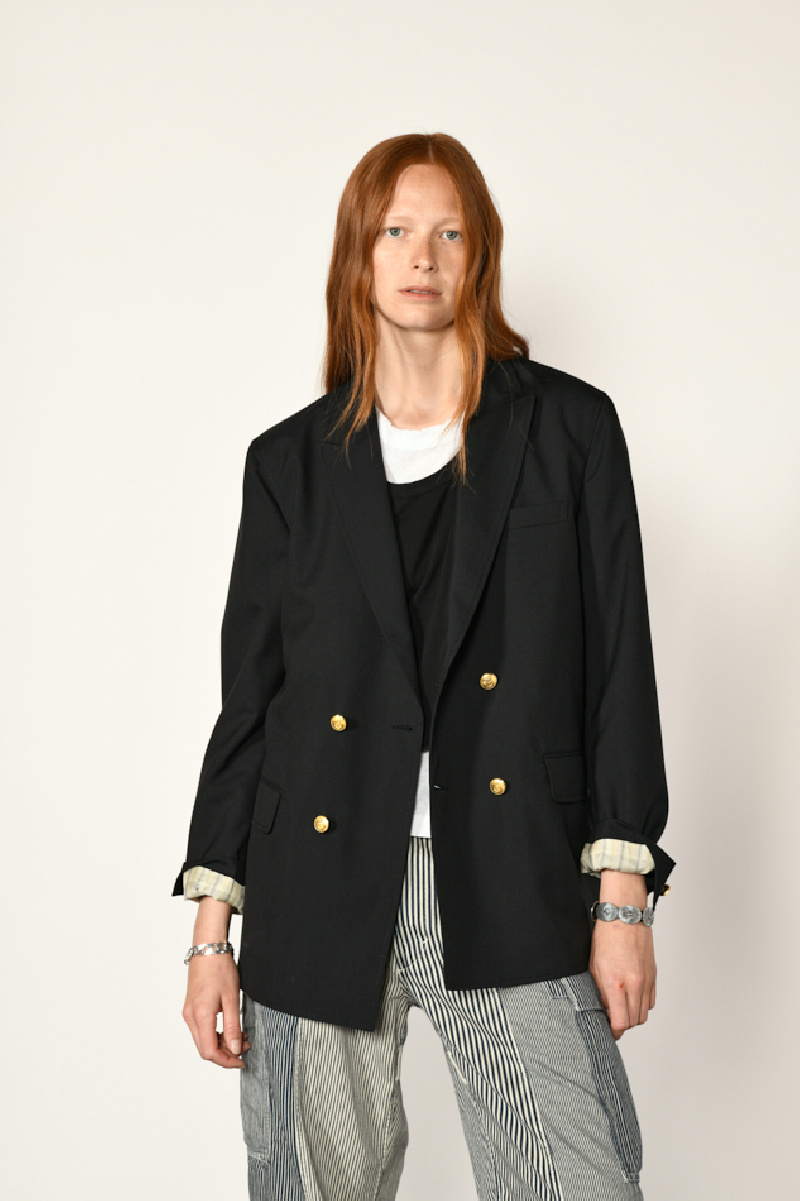 Elle offre une coupe masculine ample, un col cranté surpiqué, des boutons dorés à ancre, 1 poche poitrine passepoilée, deux poches à rabat et des poches intérieures.