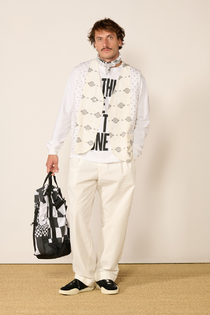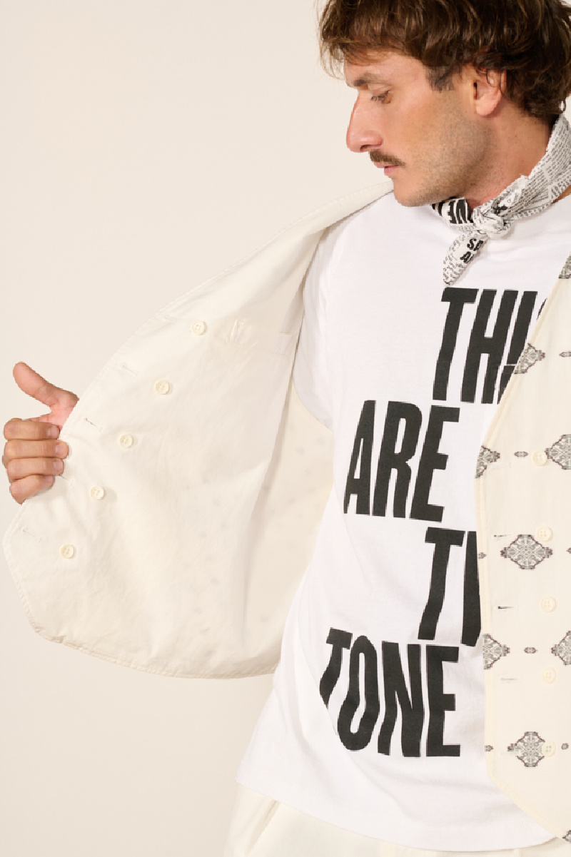 Il présente un envers minimaliste blanc avec poche passepoilée au niveau de la poitrine, et un revers à motifs avec poches plaquées.