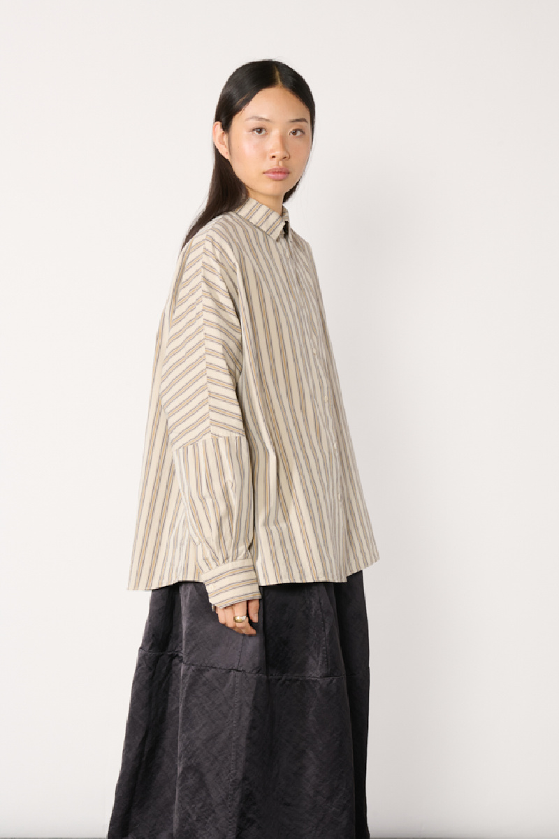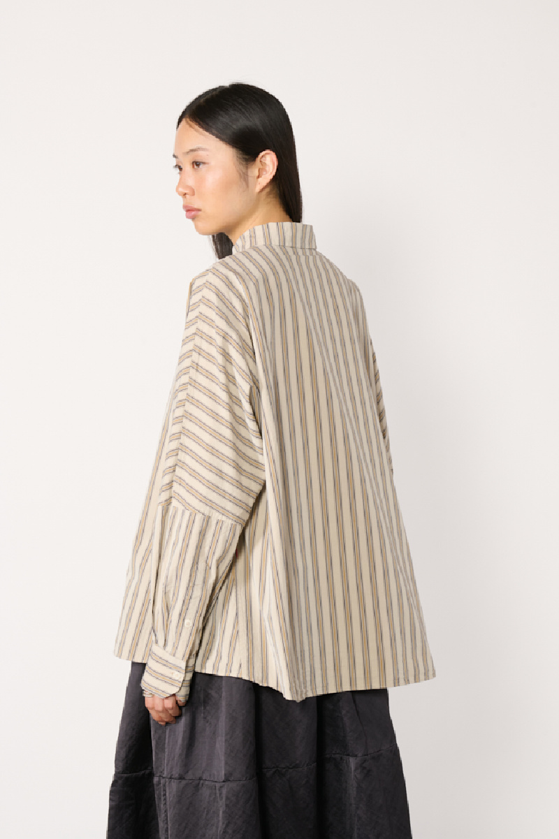 Chemise à manches longues beige à rayures camel et noires en coton ,de la marque Casey Casey.