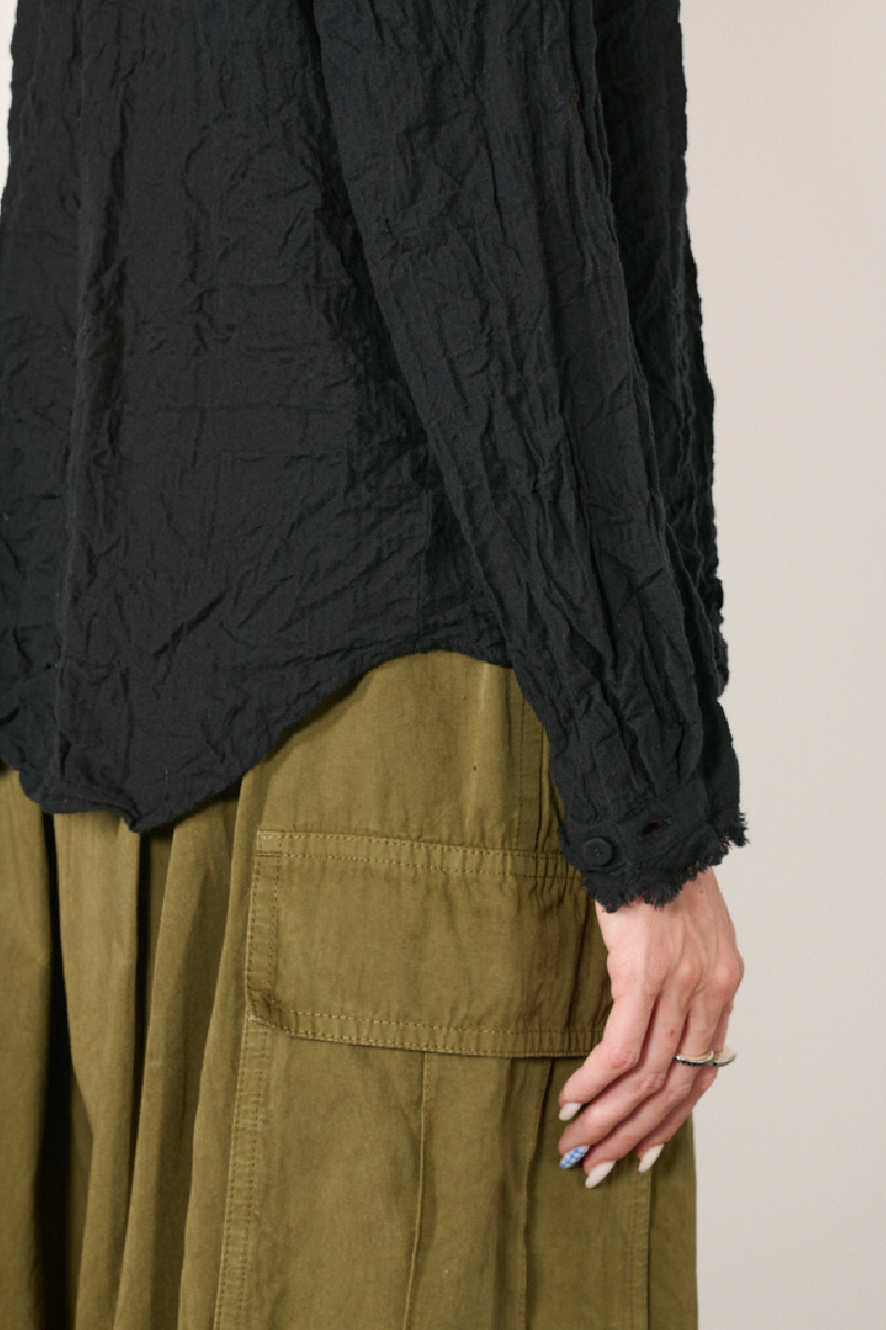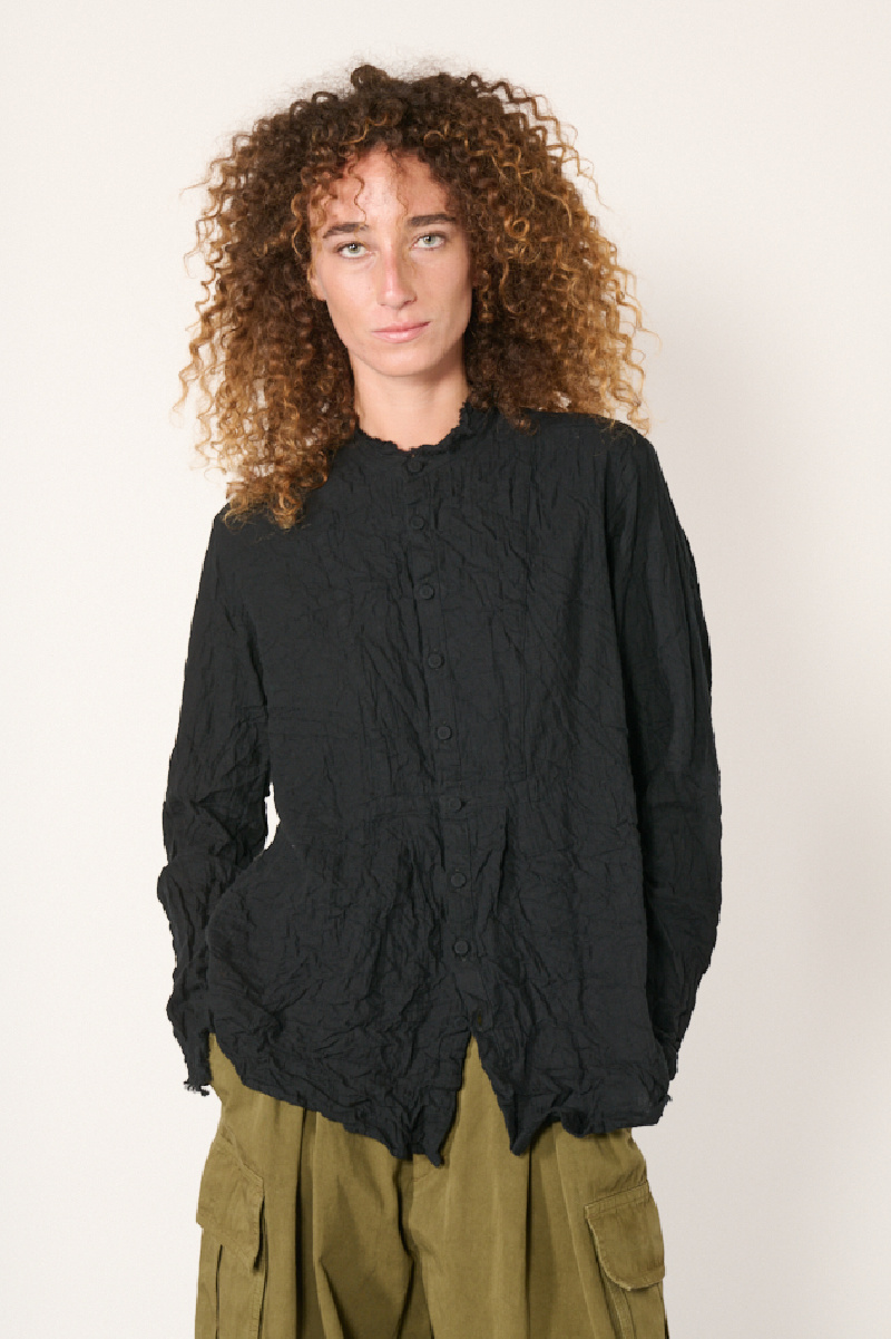 Blouse noire à fronces confectionnée en coton léger tissé à effet froissé, de la marque Pas de Calais.