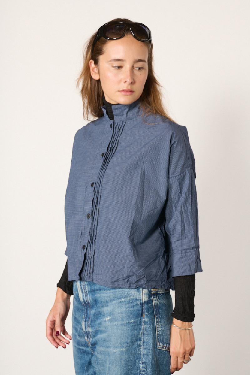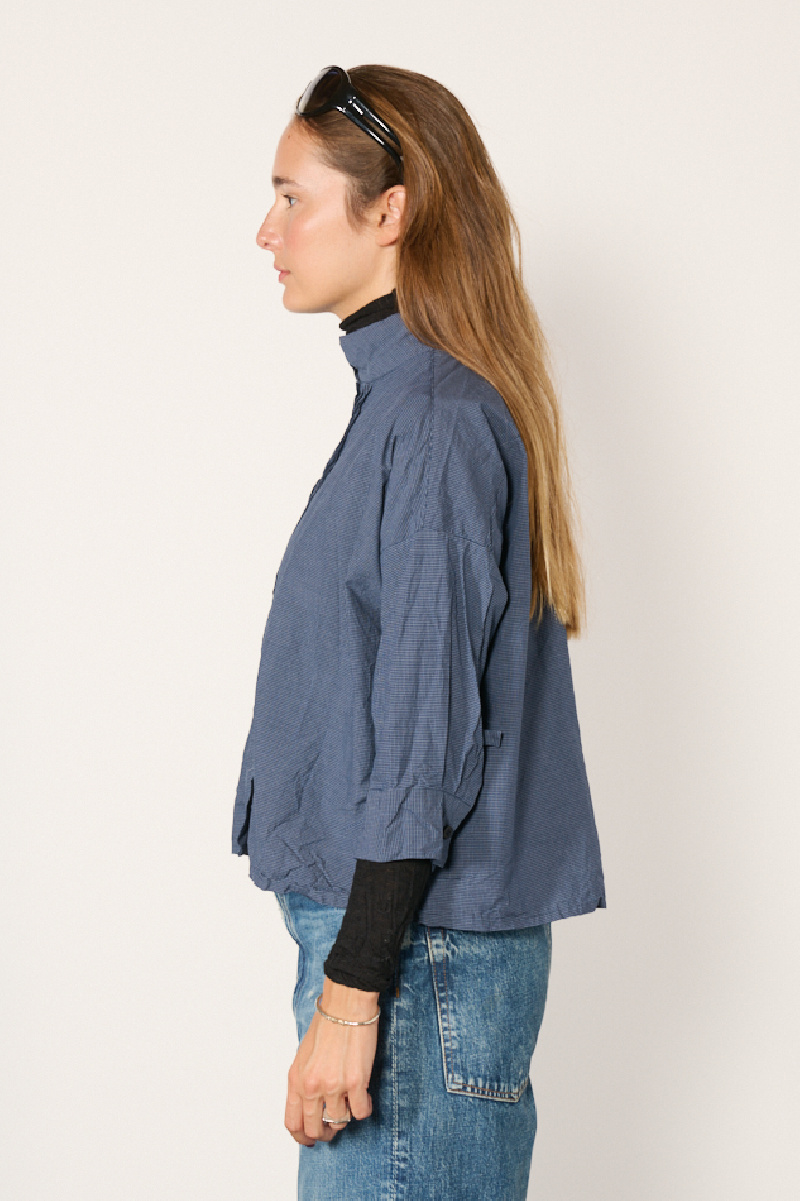 Elle offre une coupe boxy, légèrement raccourcie, des manches 3/4, des poignets boutonnés, un col montant, une patte de boutonnage plissée et des plis Tyrol à l’empiècement dorsal.