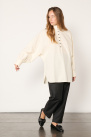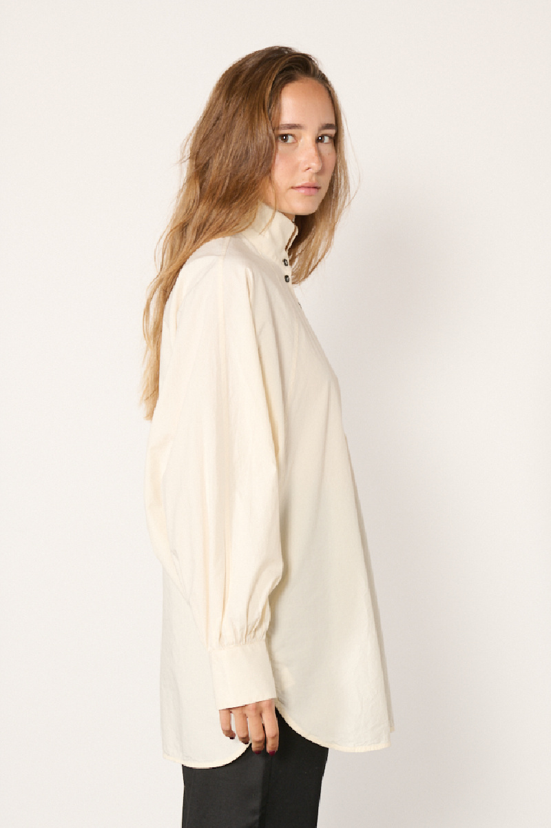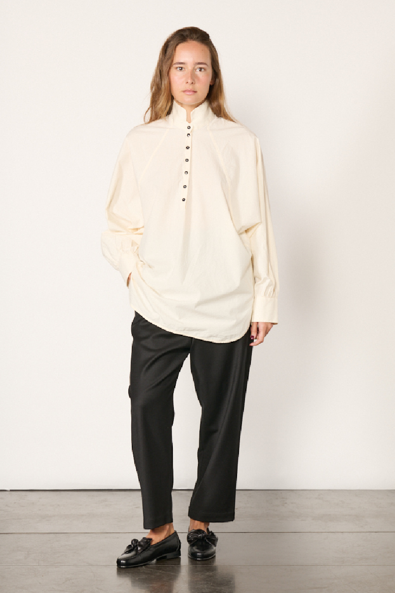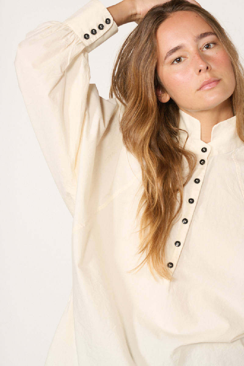 Elle offre une coupe oversize, un col impérial élégant souligné par une patte de boutonnage aux boutons contrastants, des manches chauve-souris fluides et un large poignet boutonné avec fronces.